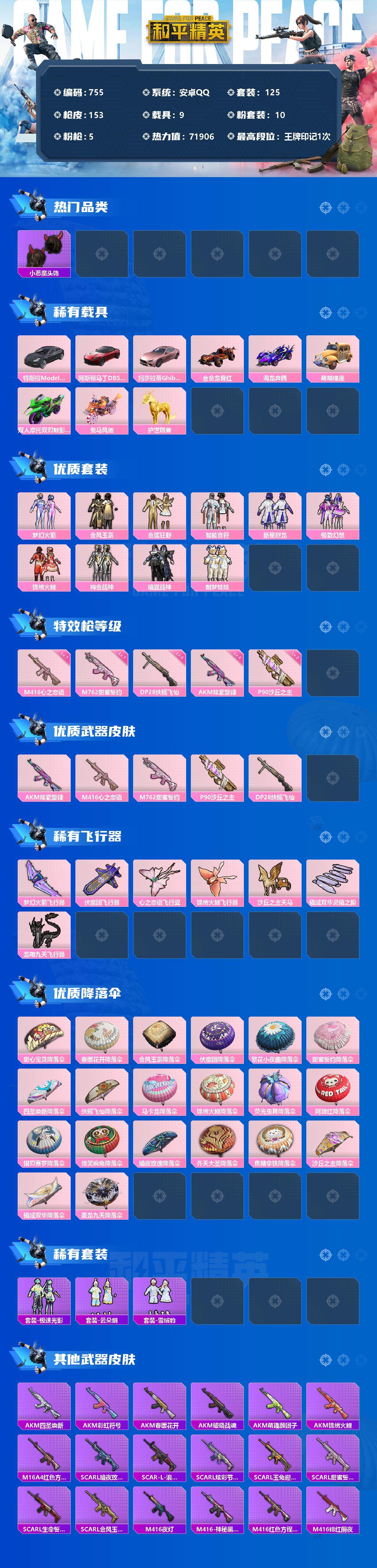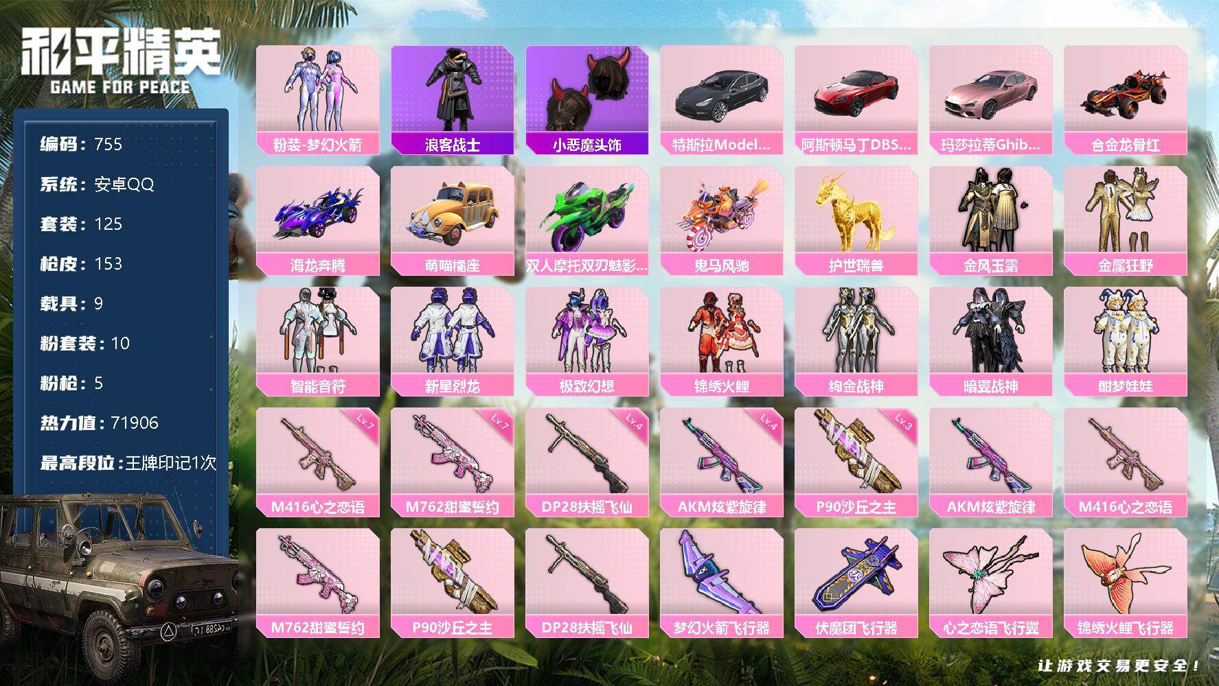[12368077]【商品标题】:安卓 手Q-10粉装-5特效枪-9载具-7粉色飞行器-71906热力值-1王牌印记-125套装-153枪皮 【热门品类】:粉装-梦幻火箭,套装-浪客战士,小恶魔头饰 【粉色载具】:特斯拉Model 3(冷光银),阿斯顿马丁DBS(红),玛莎拉蒂Ghibli(粉),合金龙骨(红),海龙奔腾,萌喵橘座,双人摩托-双刃魅影(绿),鬼马风驰,护世瑞兽 【粉色套装】:粉装-梦幻火箭,粉装-金风玉露,粉装-金属狂野,粉装-智能音符,粉装-新星烈龙,粉装-极致幻想,粉装-锦绣火鲤,粉装-绚金战神,粉装-暗翼战神,粉装-酣梦娃娃 【粉色枪皮等级】:AKM-炫紫旋律(四级),M416-心之恋语(七级),M762-甜蜜誓约(七级),P90-沙丘之主(三级),DP-28-扶摇飞仙(四级) 【粉色枪皮】:AKM-炫紫旋律,M416-心之恋语,M762-甜蜜誓约,P90-沙丘之主,DP-28-扶摇飞仙 【粉色飞行器】:梦幻火箭飞行器,伏魔团飞行器,心之恋语飞行翼,锦绣火鲤飞行器,沙丘之主天马,镜域双华-灵镜之阶,龙翔九天飞行器 【粉色降落伞】:甜心宝贝降落伞,春暖花开降落伞,金风玉露降落伞,伏魔团降落伞,繁花小夜曲降落伞,甜蜜誓约降落伞,四圣焕新降落伞,扶摇飞仙降落伞,马卡龙降落伞,锦绣火鲤降落伞,荧光虫舞降落伞,阿狸红降落伞,银刃赛罗降落伞,怪笑疯兔降落伞,暗夜玫瑰降落伞,齐天大圣降落伞,焦糖拿铁降落伞,沙丘之主降落伞,镜域双华降落伞,墨龙九天降落伞 【稀有套装】:套装-极速光影,套装-云朵鹅,套装-雪绒豹 【稀有枪皮】:AKM-四圣焕新,AKM-彩虹符号,AKM-春暖花开,AKM-破晓战魂,AKM-萌趣颜团子,AKM-锦绣火鲤,M16A4-红色方程式,SCAR-L-暗夜玫瑰,SCAR-L-浪客战士,SCAR-L-炫彩节奏,SCAR-L-玉兔迎春,SCAR-L-甜蜜誓约,SCAR-L-生命誓言,SCAR-L-金风玉露,M416-夜灯,M416-神秘黑猫,M416-红色方程式,M416-绯红前夜,M416-蓝色火焰,GROZA-彩虹符号,GROZA-治愈之星,AUG-天降萌叽,AUG-怪笑疯兔,AUG-耀粉歌者,AUG-青春冒险家,AUG-魔法学院,QBZ-原初圣火,QBZ-彩虹符号,QBZ-潮汐统领,QBZ-赛罗,M762-拳皇97,M762-绯红前夜,M762-镭射皇者,