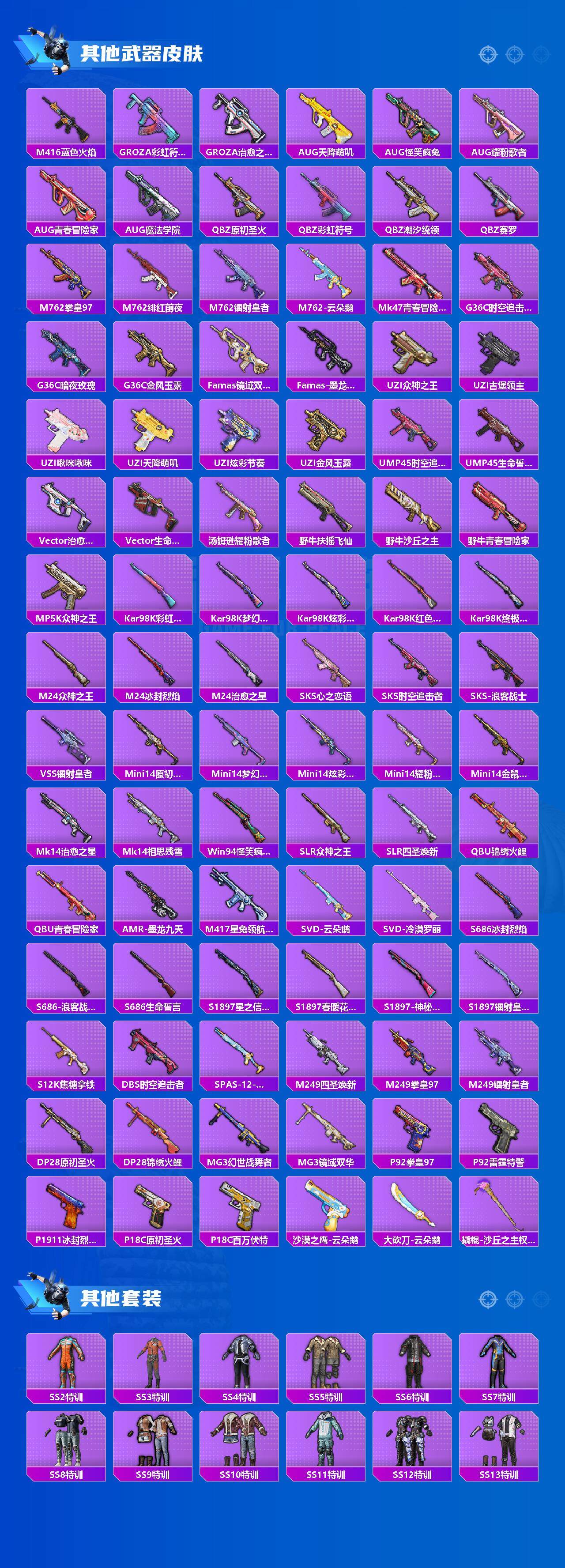 【稀有枪皮】:AKM-四圣焕新,AKM-彩虹符号,AKM-春暖花开,AKM-破晓战魂,AKM-萌趣颜团子,AKM-锦绣火鲤,M16A4-红色方程式,SCAR-L-暗夜玫瑰,SCAR-L-浪客战士,SCAR-L-炫彩节奏,SCAR-L-玉兔迎春,SCAR-L-甜蜜誓约,SCAR-L-生命誓言,SCAR-L-金风玉露,M416-夜灯,M416-神秘黑猫,M416-红色方程式,M416-绯红前夜,M416-蓝色火焰,GROZA-彩虹符号,GROZA-治愈之星,AUG-天降萌叽,AUG-怪笑疯兔,AUG-耀粉歌者,AUG-青春冒险家,AUG-魔法学院,QBZ-原初圣火,QBZ-彩虹符号,QBZ-潮汐统领,QBZ-赛罗,M762-拳皇97,M762-绯红前夜,M762-镭射皇者,