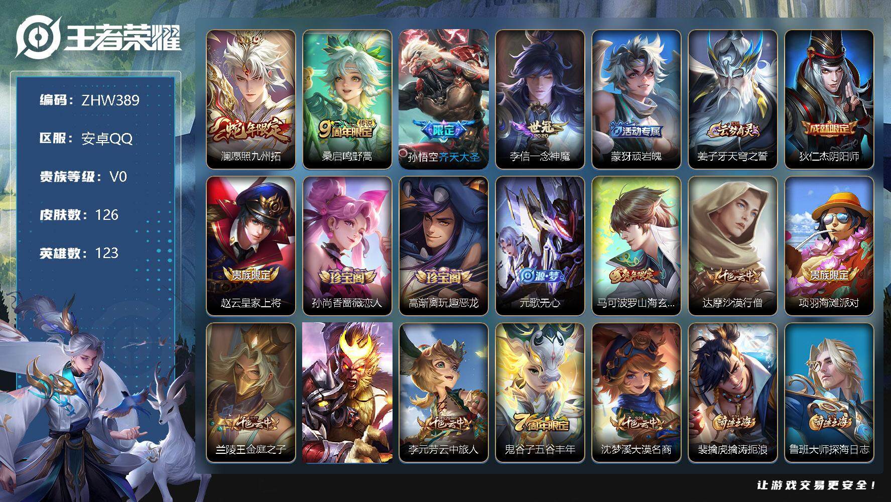 [12367854]【特价急出/详情看图】:安卓Q-V0-永恒钻石I段位-123英雄-126皮肤-0典藏-0珍品无双-0无双-0珍品传说-4传说-29史诗