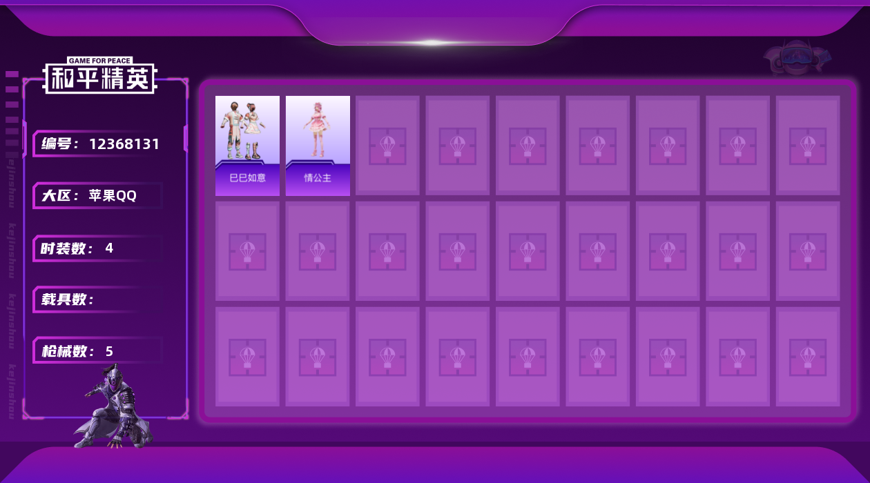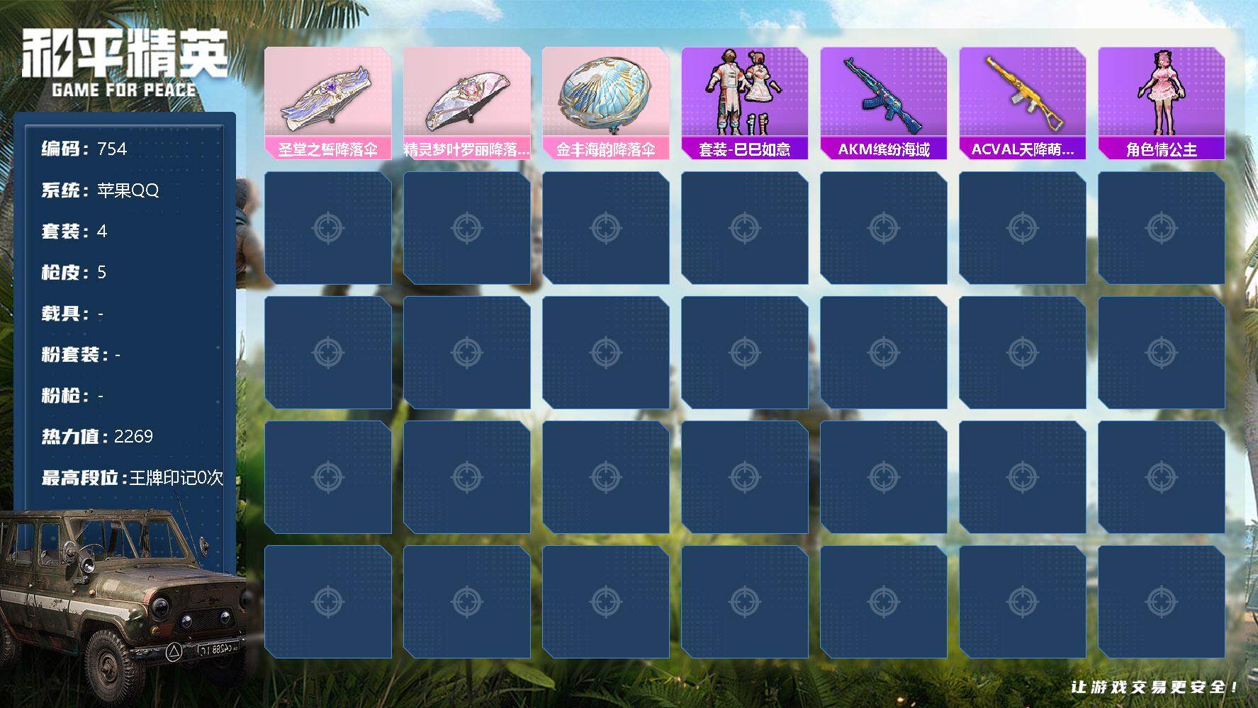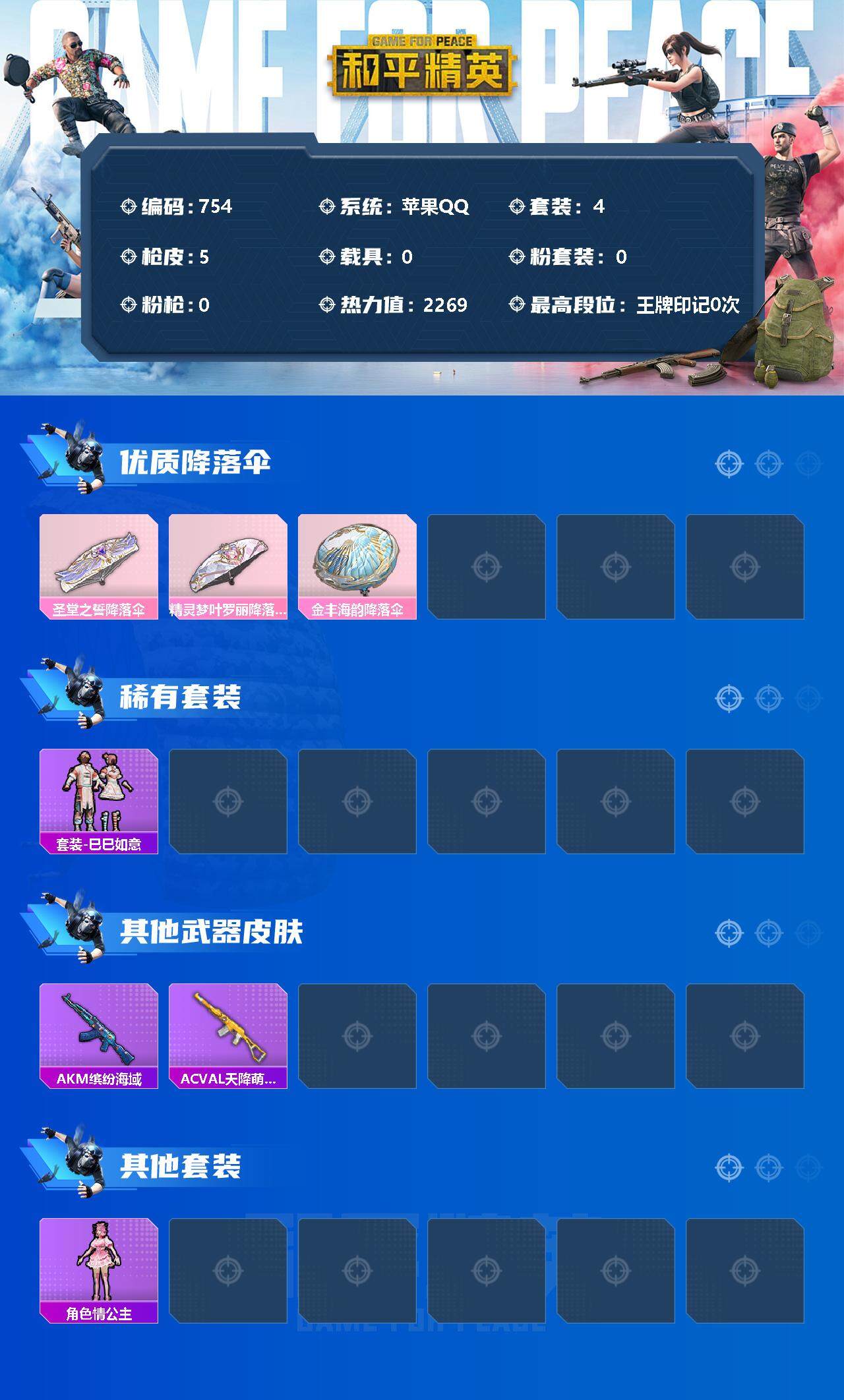 [12368131]【商品标题】:苹果 手Q-0粉装-0特效枪-0载具-0粉色飞行器-2269热力值-0王牌印记-4套装-5枪皮 【粉色降落伞】:圣堂之誓降落伞,精灵梦叶罗丽降落伞,金丰海韵降落伞 【稀有套装】:套装-巳巳如意 【稀有枪皮】:AKM-缤纷海域,AC-VAL-天降萌叽 【其他套装】:角色-情公主 【营地ID】:773686615