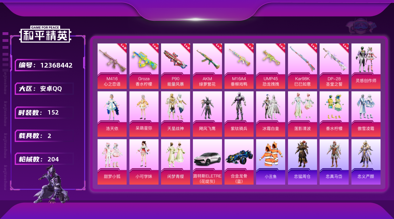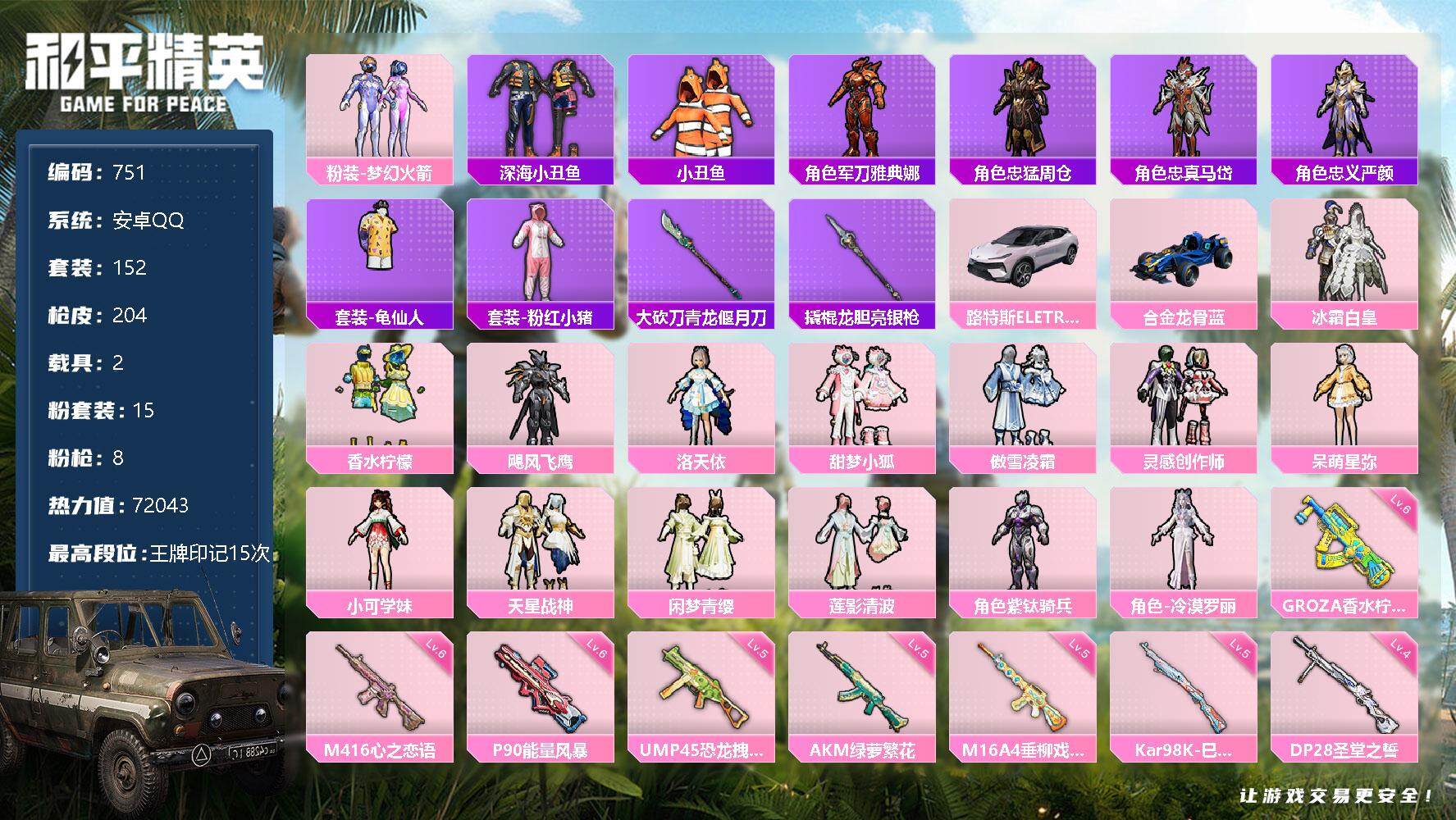 [12368442]【商品标题】:安卓 手Q-15粉装-8特效枪-2载具-4粉色飞行器-72043热力值-15王牌印记-152套装-204枪皮 【热门品类】:粉装-梦幻火箭,套装-深海小丑鱼,套装-小丑鱼,角色-军刀雅典娜,角色-忠猛周仓,角色-忠真马岱,角色-忠义严颜,套装-龟仙人,套装-粉红小猪,大砍刀-青龙偃月刀,撬棍-龙胆亮银枪 【粉色载具】:路特斯ELETRE(花绽灰),合金龙骨(蓝) 【粉色套装】:粉装-梦幻火箭,粉装-冰霜白皇,粉装-香水柠檬,粉装-飓风飞鹰,角色-洛天依,粉装-甜梦小狐,粉装-傲雪凌霜,粉装-灵感创作师,角色-呆萌星弥,角色-小可学妹,粉装-天星战神,粉装-闲梦青缨,粉装-莲影清波,角色-紫钛骑兵,角色-冷漠罗丽 【粉色枪皮等级】:AKM-绿萝繁花(五级),M16A4-垂柳戏鸭(五级),M416-心之恋语(六级),GROZA-香水柠檬(六级),UMP45-恐龙拽拽(五级),P90-能量风暴(六级),Kar98K-巳巳如意(五级),DP-28-圣堂之誓(四级) 【粉色枪皮】:AKM-绿萝繁花,M16A4-垂柳戏鸭,M416-心之恋语,GROZA-香水柠檬,UMP45-恐龙拽拽,P90-能量风暴,Kar98K-巳巳如意,DP-28-圣堂之誓 【粉色飞行器】:梦幻火箭飞行器,青春物语飞行器,绝色倾城飞行器 【粉色降落伞】:梦幻火箭降落伞,童趣迷兔降落伞,香水柠檬降落伞,怪笑疯兔降落伞,古战神甲降落伞,齐天大圣降落伞,恐龙拽拽降落伞,环太平洋降落伞,绒雪飘舞降落伞,垂柳戏鸭降落伞,仲夏莫吉托降落伞,白勺歌姬降落伞,天星战神降落伞,未来歌姬降落伞,莲影清波降落伞,江南烟雨降落伞,冷漠罗丽降落伞,荧海星豚降落伞 【稀有套装】:套装-龟仙人,套装-巳巳如意,套装-雏菊兔兔,套装-萝兰蝴蝶,套装-小熊娃娃,角色-许七安,套装-燕燕于飞,套装-鱼渊荷华,角色-海琴烟,套装-晶辉守护,套装-彩虹兔,套装-云朵鹅,套装-雪绒豹,套装-蓝海鲸歌 【稀有枪皮】:AKM-2P战斗服款,AKM-恐龙拽拽,AKM-生命誓言,AKM-破晓战魂,AKM-缤纷海域,AKM-胡桃卫兵,AKM-虎虎生威,M16A4-幻世战舞者,M16A4-甜心亚梦,M16A4-莲影清波,M16A4-蓝色火焰,M16A4-千金淑猫,SCAR-L-炫彩节奏,SCAR-L-玉兔迎春,SCAR-L-红色方程式,SCA