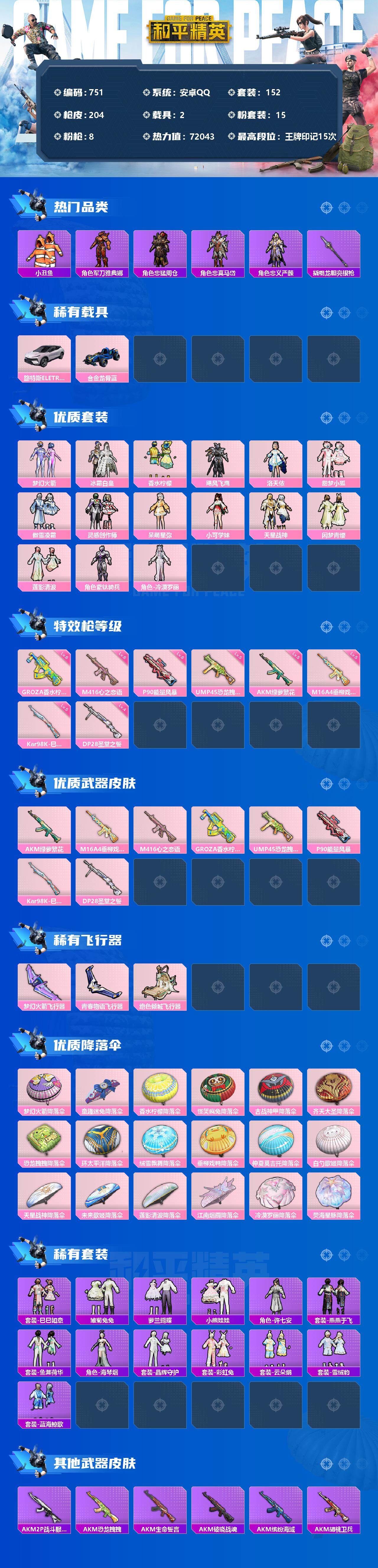 [12368442]【商品标题】:安卓 手Q-15粉装-8特效枪-2载具-4粉色飞行器-72043热力值-15王牌印记-152套装-204枪皮