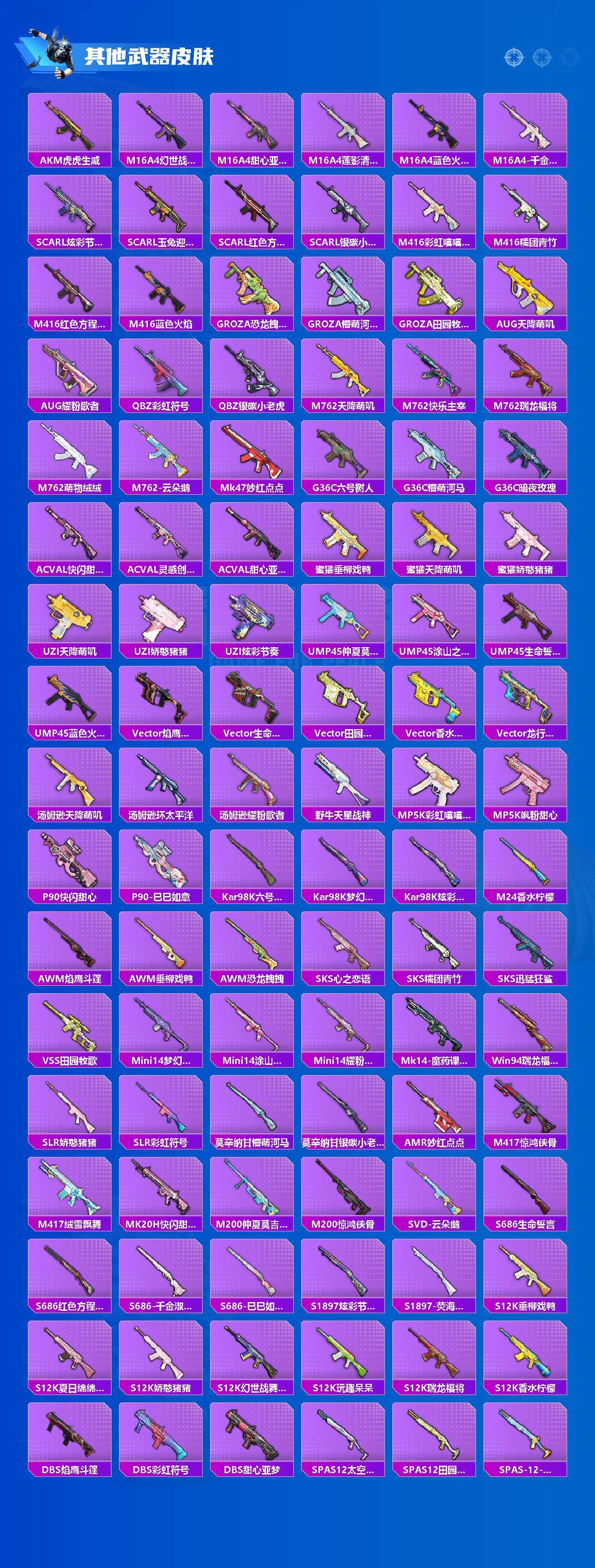 【稀有枪皮】:AKM-2P战斗服款,AKM-恐龙拽拽,AKM-生命誓言,AKM-破晓战魂,AKM-缤纷海域,AKM-胡桃卫兵,AKM-虎虎生威,M16A4-幻世战舞者,M16A4-甜心亚梦,M16A4-莲影清波,M16A4-蓝色火焰,M16A4-千金淑猫,SCAR-L-炫彩节奏,SCAR-L-玉兔迎春,SCAR-L-红色方程式,SCA