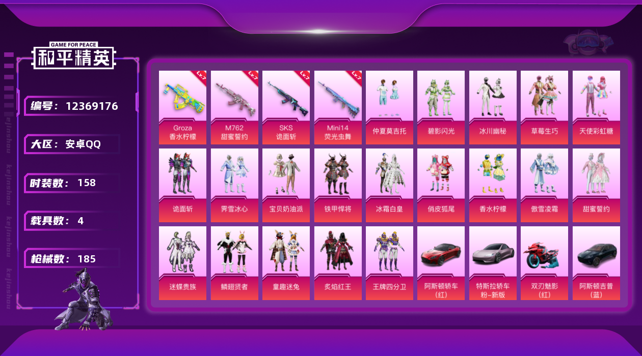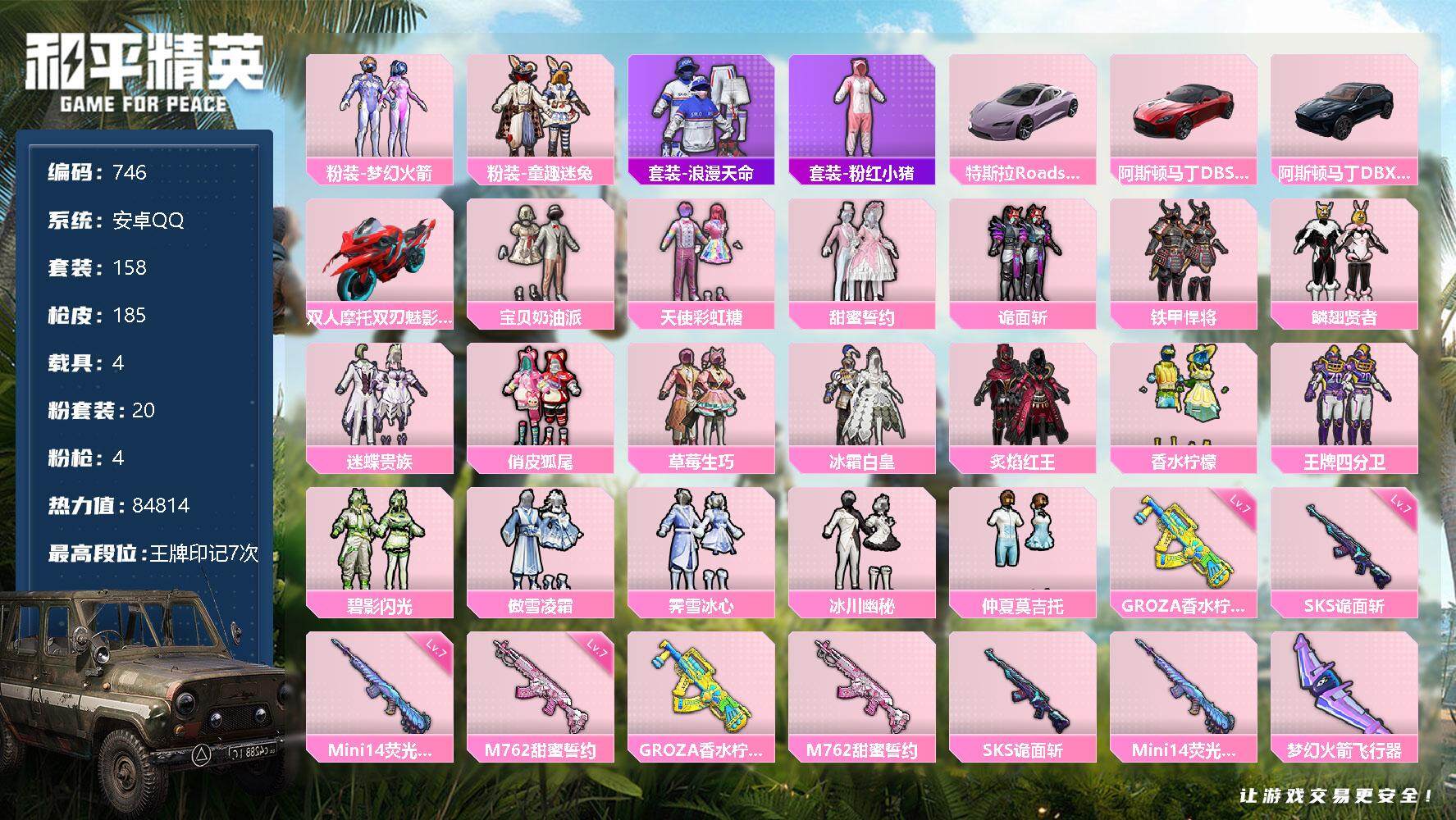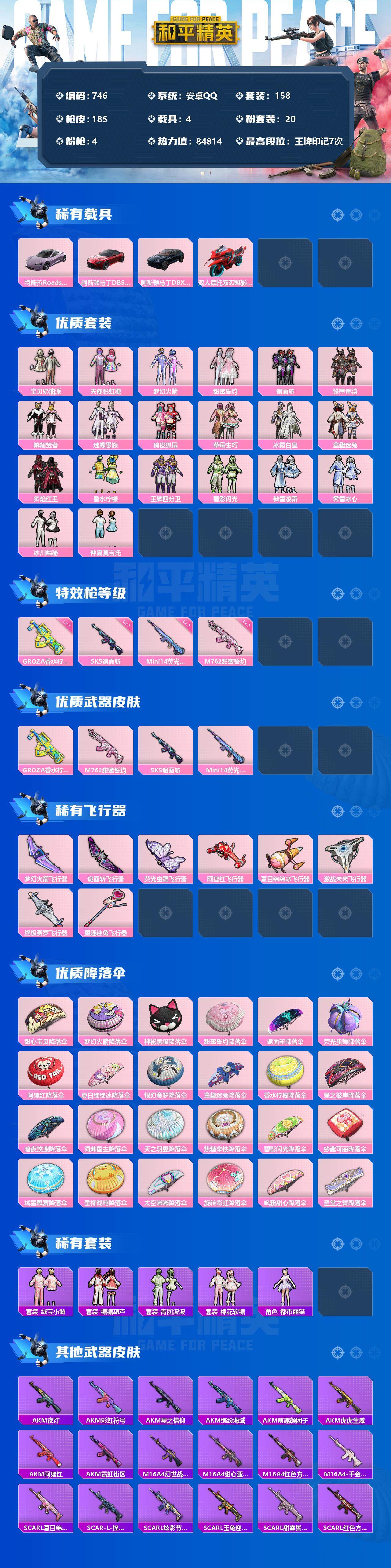 [12369176]【商品标题】:安卓 手Q-20粉装-4特效枪-4载具-8粉色飞行器-84814热力值-7王牌印记-158套装-185枪皮