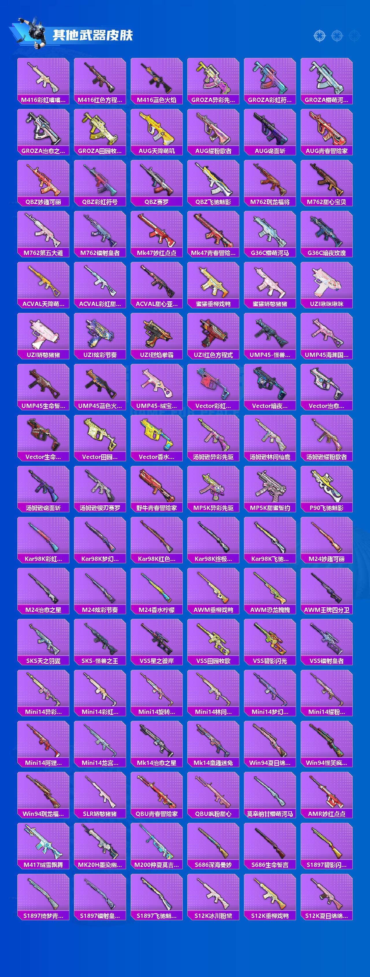 【稀有枪皮】:AKM-夜灯,AKM-彩虹符号,AKM-星之信仰,AKM-缤纷海域,AKM-萌趣颜团子,AKM-虎虎生威,AKM-阿狸红,AKM-霓虹街区,M16A4-幻世战舞者,M16A4-甜心亚梦,M16A4-红色方程式,M16A4-千金淑猫,SCAR-L-夏日绵绵冰,SCAR-L-怪兽之王,SCAR-L-炫彩节奏,SCAR-L-玉兔迎春,SCAR-L-甜蜜誓约,SCAR-L-红色方程式,M416-彩虹嘻嘻猴,M416-红色方程式,M416-蓝色火焰,GROZA-异彩
