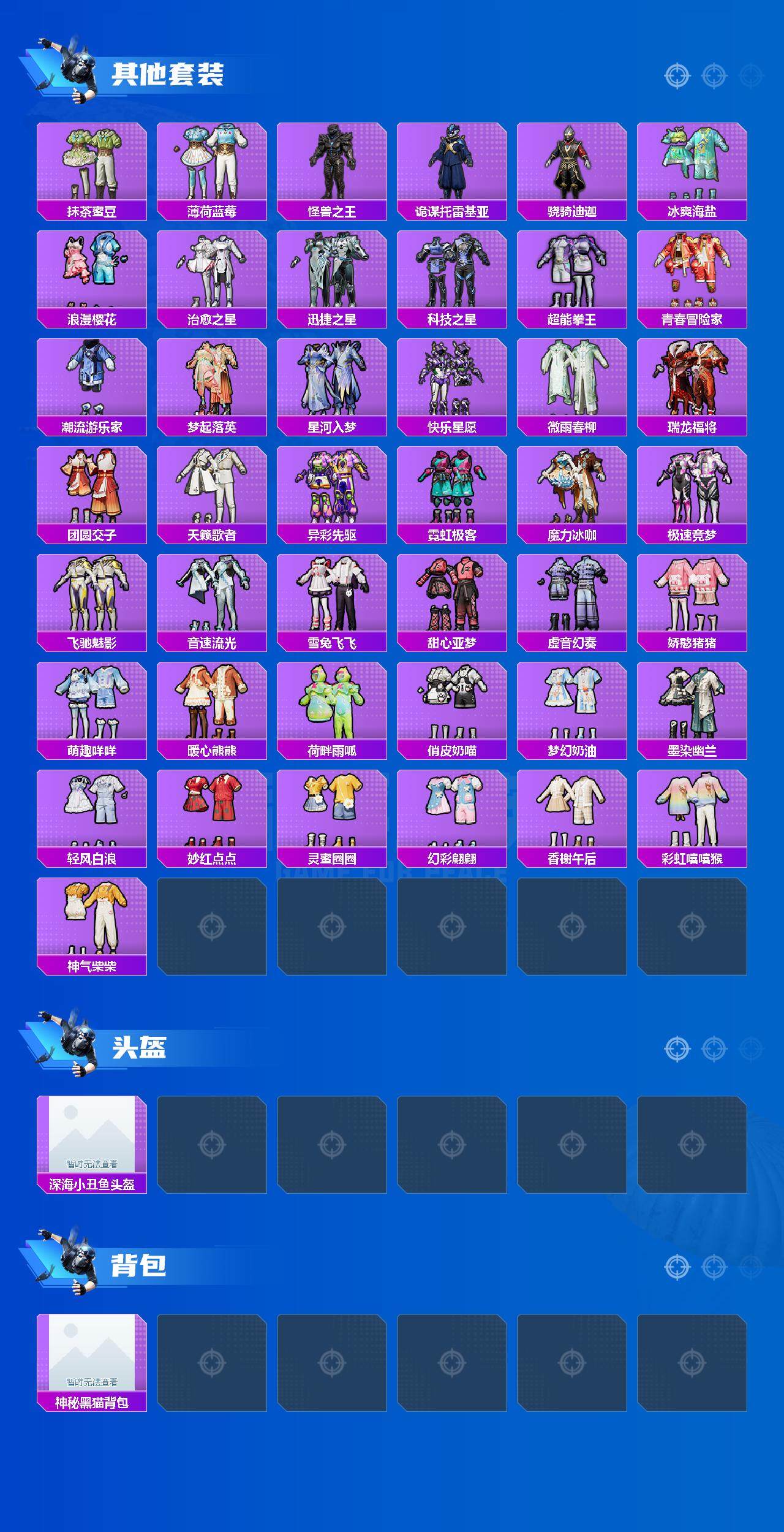 套装-仲夏莫吉托,套装-碧影闪光,套装-冰川幽秘,套装-草莓生巧,套装-天使彩虹糖,套装-诡面斩,套装-霁雪冰心,套装-宝贝奶油派,套装-铁甲悍将,套装-俏皮狐尾,套装-香水柠檬,套装-傲雪凌霜,套装-甜蜜誓约,套装-迷蝶贵族,套装-鳞翅贤者,套装-炙焰红王,套装-王牌四分卫