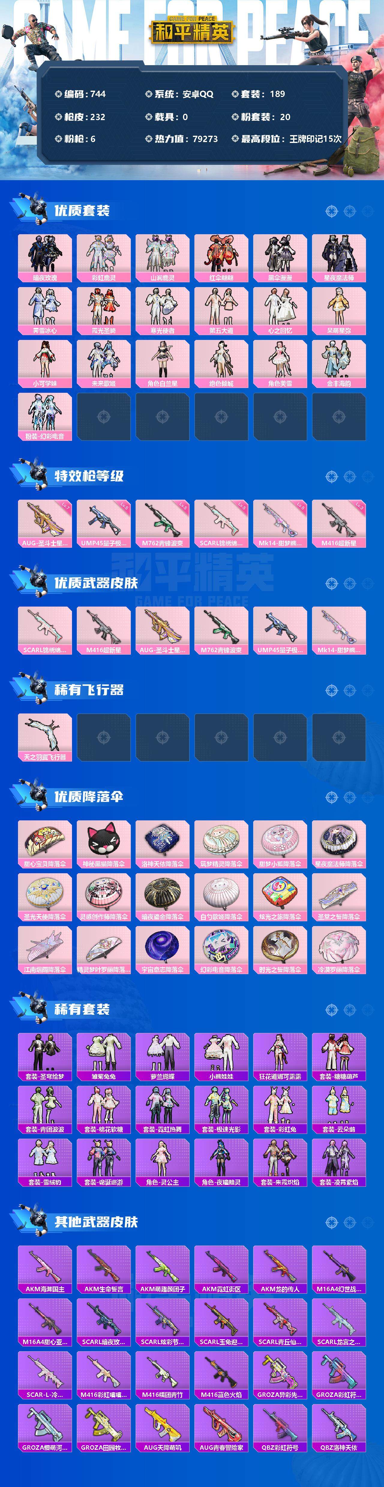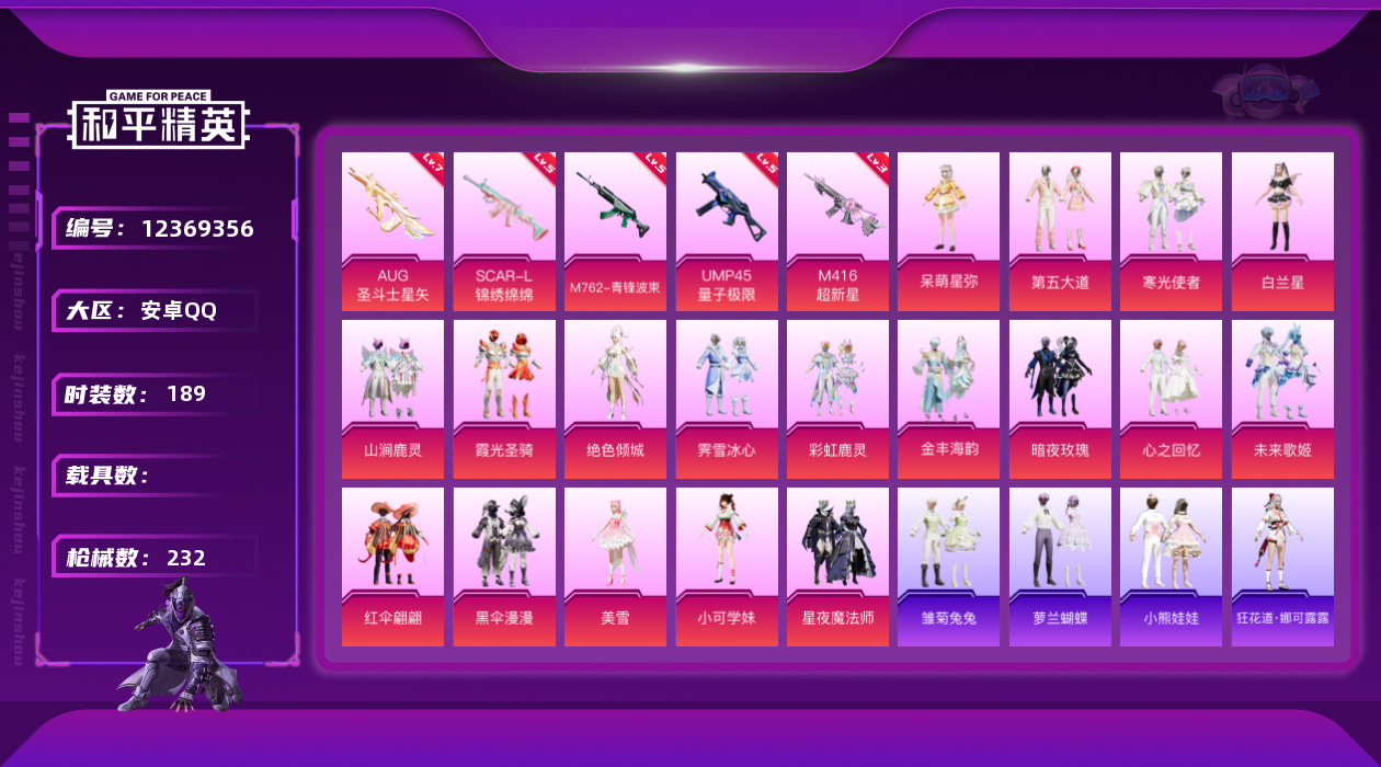 [12369356]【商品标题】:安卓 手Q-20粉装-6特效枪-0载具-1粉色飞行器-79273热力值-15王牌印记-189套装-232枪皮