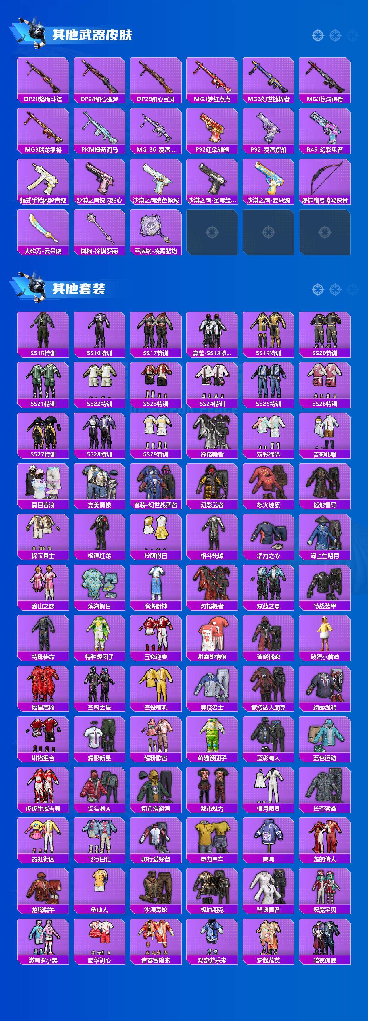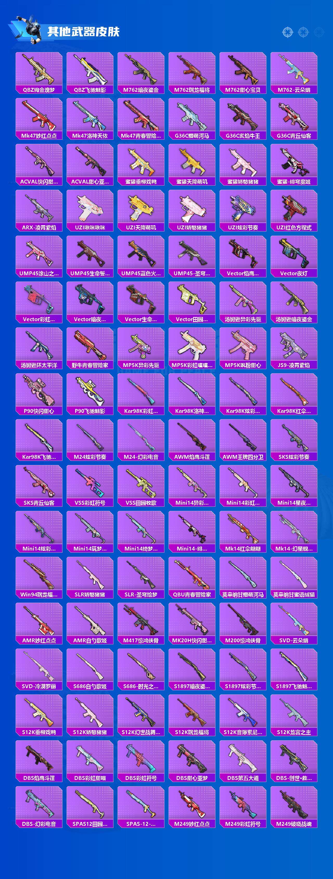 【稀有枪皮】:AKM-海渊国主,AKM-生命誓言,AKM-萌趣颜团子,AKM-霓虹街区,AKM-龙的传人,M16A4-幻世战舞者,M16A4-甜心亚梦,SCAR-L-暗夜玫瑰,SCAR-L-炫彩节奏,SCAR-L-玉兔迎春,SCAR-L-青丘仙客,SCAR-L-龙宫之主,SCAR-L-冷漠罗丽,M416-彩虹嘻嘻猴,M416-糯团青竹,M416-蓝色火焰,GROZA-异彩先驱,GROZA-彩虹符号,GROZA-懵萌河马,GROZA-田园牧歌,AUG-天降萌叽,AUG-青春冒险家,QBZ-彩虹符号,QBZ-洛神天依,QBZ-绚金瑰梦,QBZ