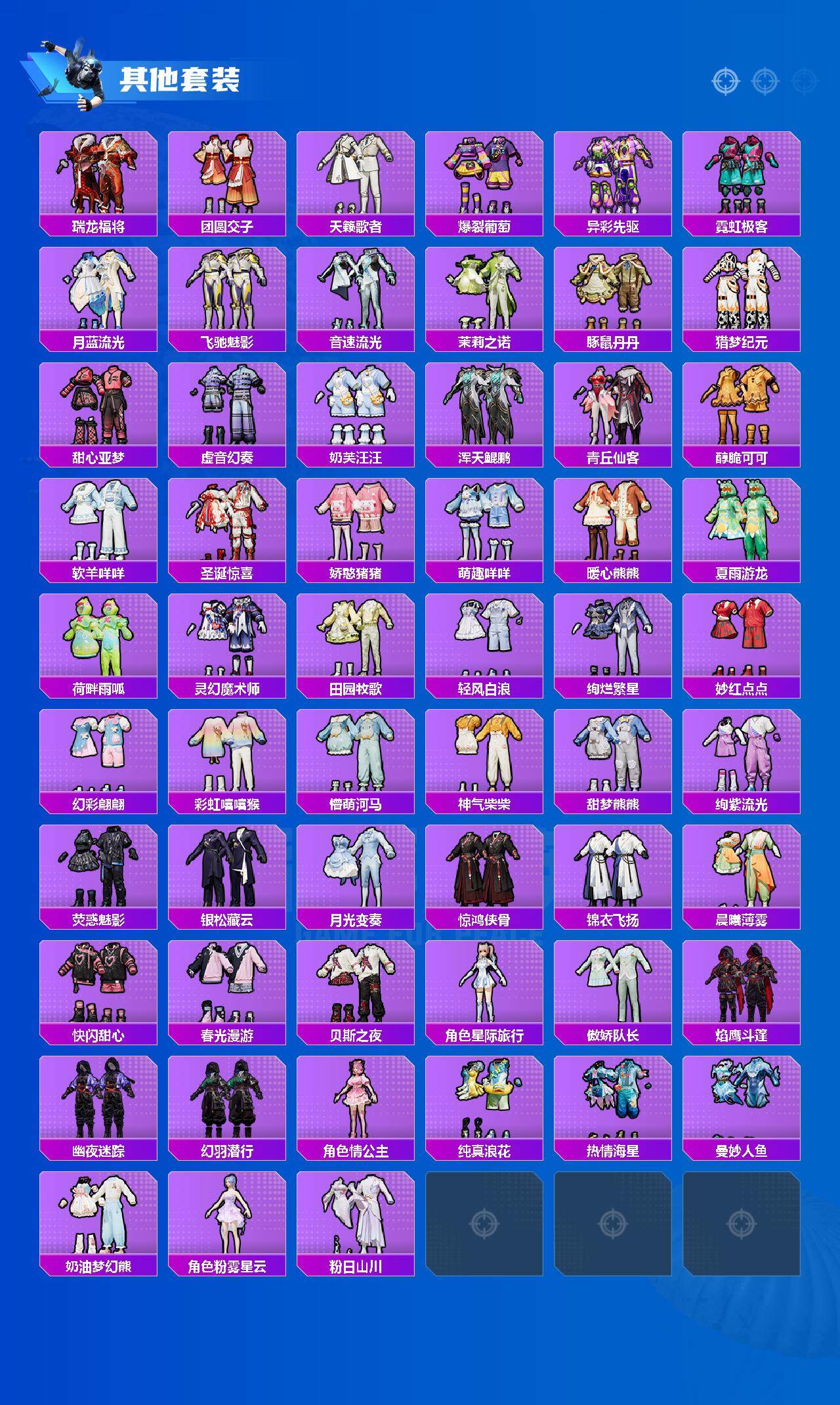 【粉色套装】:粉装-暗夜玫瑰,粉装-彩虹鹿灵,粉装-山涧鹿灵,粉装-红伞翩翩,粉装-黑伞漫漫,粉装-星夜魔法师,粉装-霁雪冰心,粉装-霞光圣骑,粉装-寒光使者,粉装-第五大道,粉装-心之回忆,角色-呆萌星弥,角色-小可学妹,粉装-未来歌姬,角色-白兰星,角色-绝色倾城,角色-美雪,粉装-金丰海韵,粉装-幻彩电音