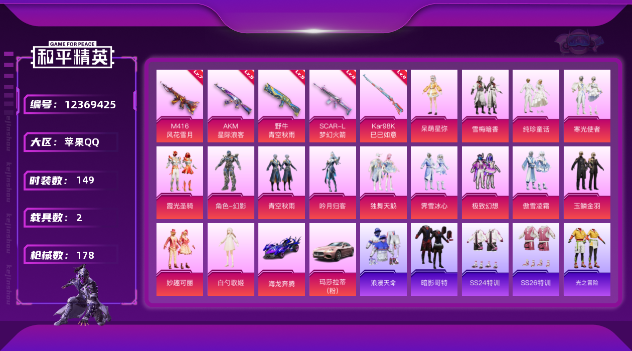 [12369425]【商品标题】:苹果 手Q-16粉装-5特效枪-2载具-3粉色飞行器-67225热力值-2王牌印记-149套装-178枪皮