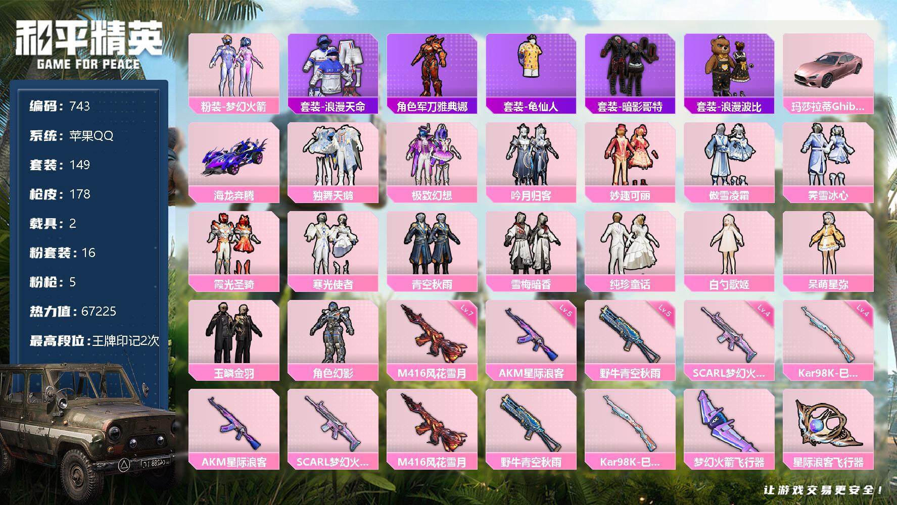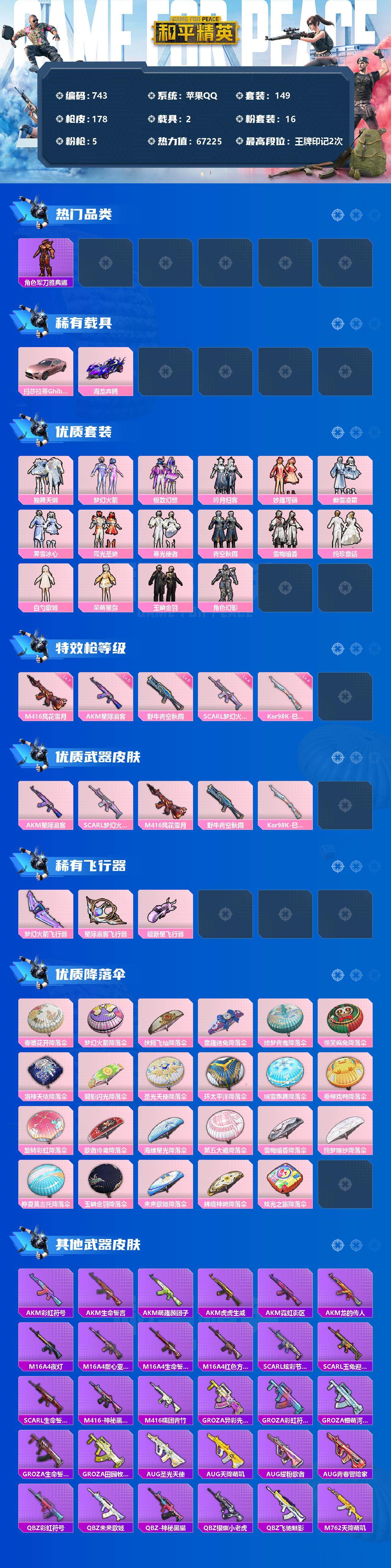 [12369425]【商品标题】:苹果 手Q-16粉装-5特效枪-2载具-3粉色飞行器-67225热力值-2王牌印记-149套装-178枪皮 【热门品类】:粉装-梦幻火箭,套装-浪漫天命,角色-军刀雅典娜,套装-龟仙人,套装-暗影哥特,套装-浪漫波比 【粉色载具】:玛莎拉蒂Ghibli(粉),海龙奔腾 【粉色套装】:粉装-独舞天鹅,粉装-梦幻火箭,粉装-极致幻想,粉装-吟月归客,粉装-妙趣可丽,粉装-傲雪凌霜,粉装-霁雪冰心,粉装-霞光圣骑,粉装-寒光使者,粉装-青空秋雨,粉装-雪梅暗香,粉装-纯珍童话,角色-白勺歌姬,角色-呆萌星弥,粉装-玉鳞金羽,角色-幻影 【粉色枪皮等级】:AKM-星际浪客(五级),SCAR-L-梦幻火箭(四级),M416-风花雪月(七级),野牛-青空秋雨(五级),Kar98K-巳巳如意(四级) 【粉色枪皮】:AKM-星际浪客,SCAR-L-梦幻火箭,M416-风花雪月,野牛-青空秋雨,Kar98K-巳巳如意 【粉色飞行器】:梦幻火箭飞行器,星际浪客飞行器,超新星飞行器 【粉色降落伞】:春暖花开降落伞,梦幻火箭降落伞,扶摇飞仙降落伞,童趣迷兔降落伞,绮梦青鸾降落伞,怪笑疯兔降落伞,洛神天依降落伞,碧影闪光降落伞,圣光天使降落伞,环太平洋降落伞,绒雪飘舞降落伞,垂柳戏鸭降落伞,旋转彩虹降落伞,歌者泠鸢降落伞,海螺星光降落伞,第五大道降落伞,雪梅暗香降落伞,纯梦嫁纱降落伞,仲夏莫吉托降落伞,玉鳞金羽降落伞,未来歌姬降落伞,拂晓神骑降落伞,炫光之旅降落伞 【稀有套装】:套装-龟仙人 【稀有枪皮】:AKM-彩虹符号,AKM-生命誓言,AKM-萌趣颜团子,AKM-虎虎生威,AKM-霓虹街区,AKM-龙的传人,M16A4-夜灯,M16A4-甜心亚梦,M16A4-生命誓言,M16A4-红色方程式,SCAR-L-炫彩节奏,SCAR-L-玉兔迎春,SCAR-L-生命誓言,M416-神秘黑猫,M416-糯团青竹,GROZA-异彩先驱,GROZA-彩虹符号,GROZA-懵萌河马,GROZA-生命誓言,GROZA-田园牧歌,AUG-圣光天使,AUG-天降萌叽,AUG-耀粉歌者,AUG-青春冒险家,QBZ-彩虹符号,QBZ-未来歌姬,QBZ-神秘黑猫,QBZ-银碳小老虎,QBZ-飞驰魅影,M762-天降萌叽,M762-瑞龙福将,Mk47-妙红点点,Mk47-青春冒险家,G36C-不夜海