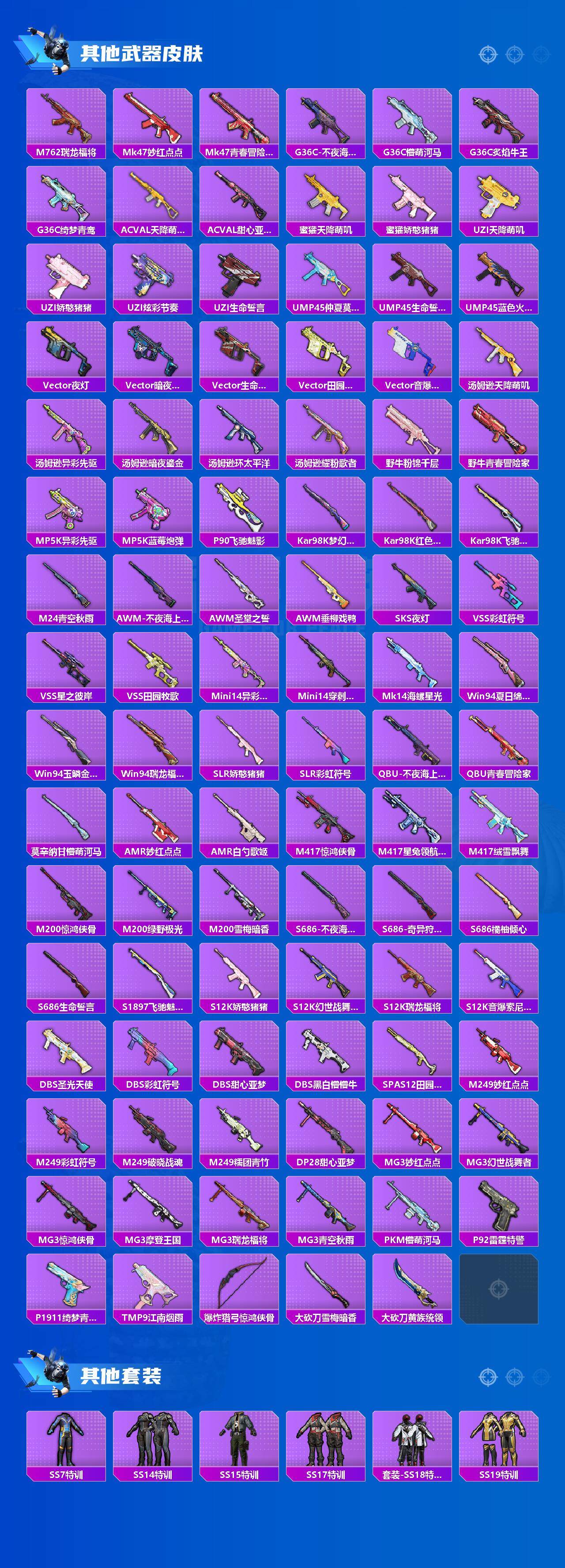 【稀有枪皮】:AKM-彩虹符号,AKM-生命誓言,AKM-萌趣颜团子,AKM-虎虎生威,AKM-霓虹街区,AKM-龙的传人,M16A4-夜灯,M16A4-甜心亚梦,M16A4-生命誓言,M16A4-红色方程式,SCAR-L-炫彩节奏,SCAR-L-玉兔迎春,SCAR-L-生命誓言,M416-神秘黑猫,M416-糯团青竹,GROZA-异彩先驱,GROZA-彩虹符号,GROZA-懵萌河马,GROZA-生命誓言,GROZA-田园牧歌,AUG-圣光天使,AUG-天降萌叽,AUG-耀粉歌者,AUG-青春冒险家,QBZ-彩虹符号,QBZ-未来歌姬,QBZ-神秘黑猫,QBZ-银碳小老虎,QBZ-飞驰魅影,M762-天降萌叽,M762-瑞龙福将,Mk47-妙红点点,Mk47-青春冒险家,G36C-不夜海