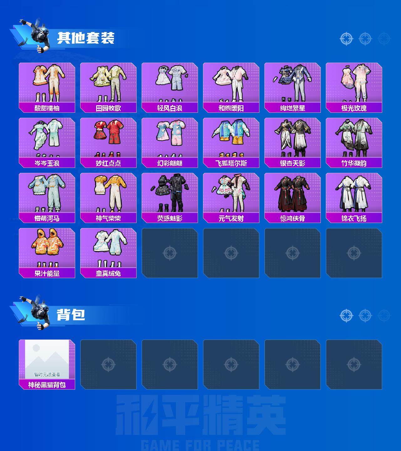 角色-呆萌星弥,套装-雪梅暗香,套装-纯珍童话,套装-寒光使者,套装-霞光圣骑,角色-幻影,套装-青空秋雨,套装-吟月归客,独舞天鹅套装,套装-霁雪冰心,套装-极致幻想,套装-傲雪凌霜,套装-玉鳞金羽,套装-妙趣可丽,角色-白勺歌姬