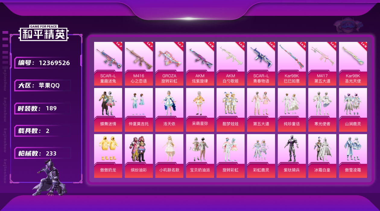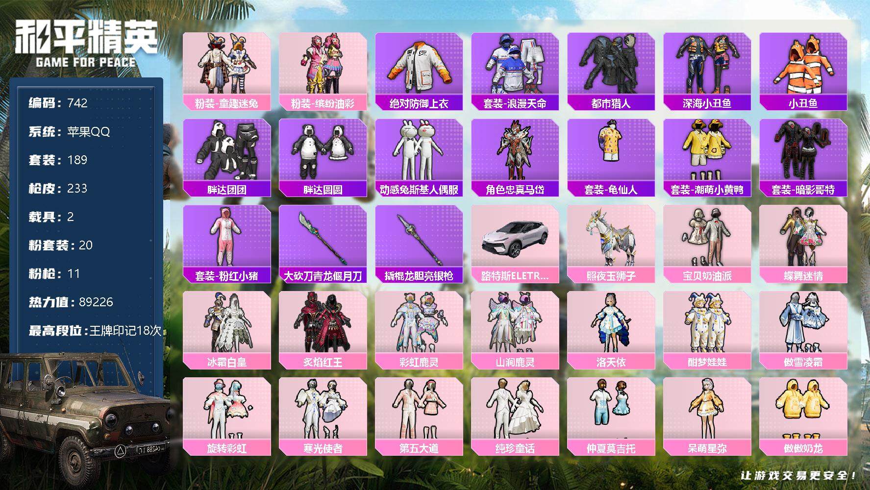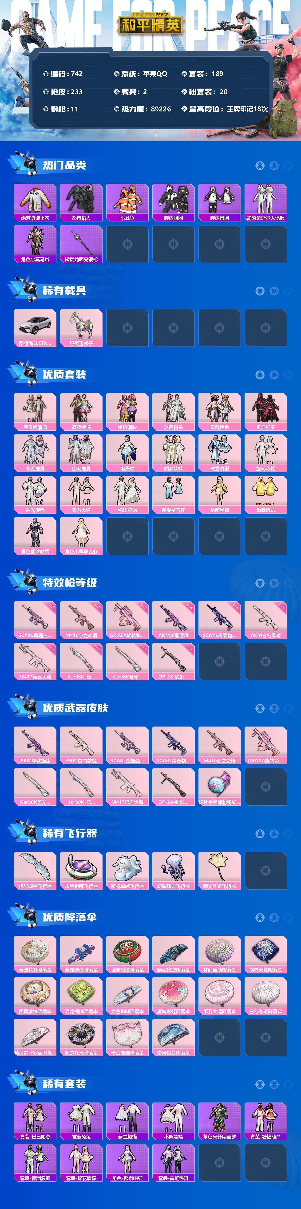 [12369526]【商品标题】:苹果 手Q-20粉装-11特效枪-2载具-5粉色飞行器-89226热力值-18王牌印记-189套装-233枪皮