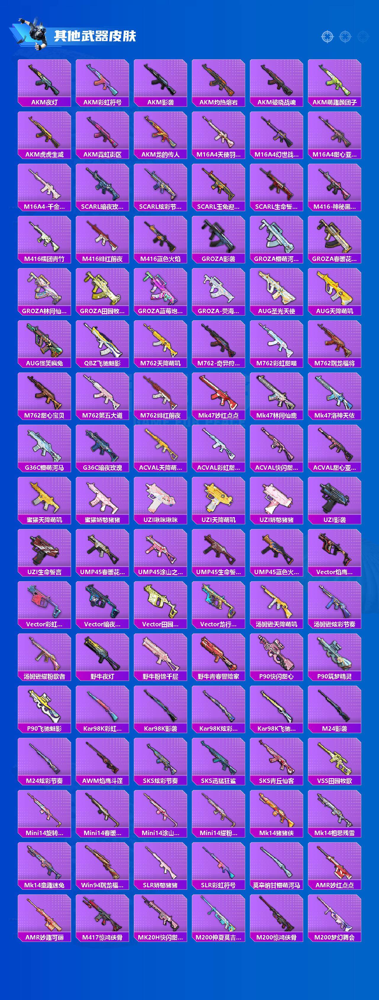 【粉色枪皮】:AKM-炫紫旋律,AKM-白勺歌姬,SCAR-L-童趣迷兔,SCAR-L-青春物语,M416-心之恋语,GROZA-旋转彩虹,Kar98K-圣光天使,Kar98K-巳巳如意,M417-第五大道,DP-28-豹影疾电,破片手榴弹-粉粉猫爪