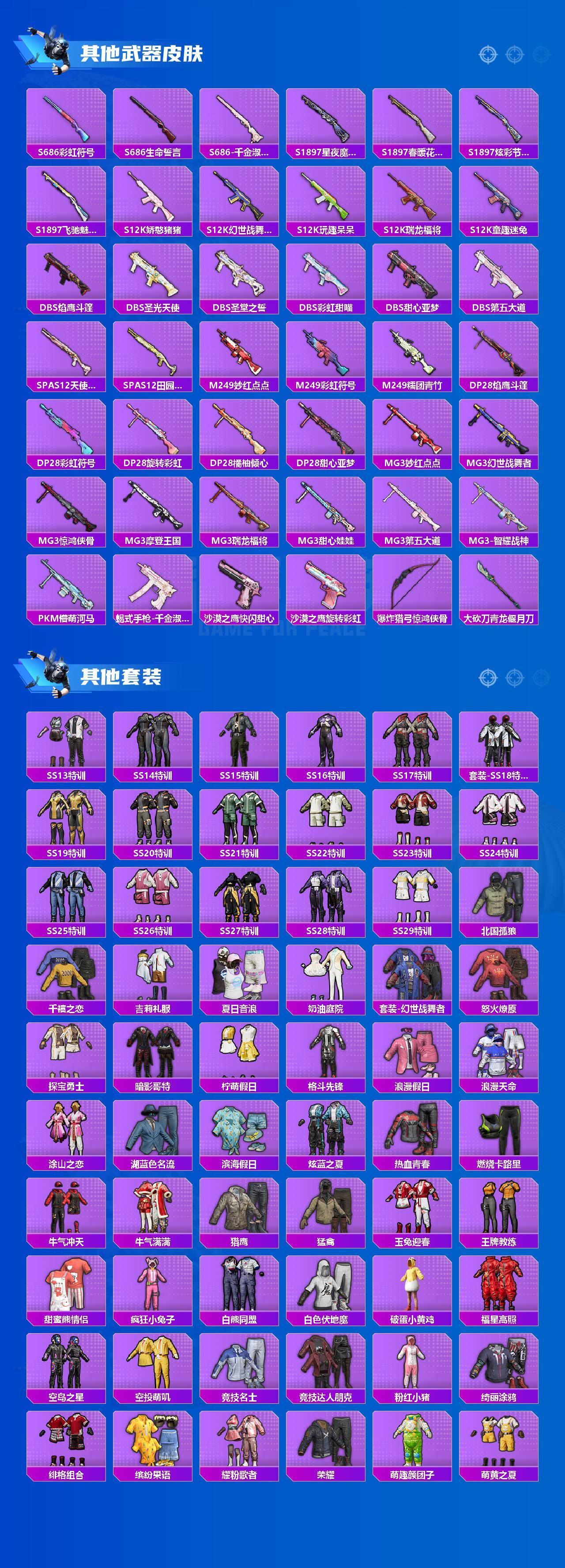 - [11864139]6粉装 9特效枪 13印记 可二次 可修改实名 战神框 身法装备:都市猎人,Mark.06(新蓝螳螂) 优质装备:都市猎人,AKM炫紫旋律,M416心之恋语,梦幻火箭(新101)(新火箭少女101粉色套装),放客神游,智能音符,SCAR-L纯梦嫁纱,SCAR-L-锦绣绵绵,七级M416-心之恋语,M416电玩时刻,UMP45量子极限,AKM魔法神域,星穹咏叹调,Kar98K-巳巳如意 热门装扮:呆萌星弥,圣堂之誓,胖达团团,迅捷狂鲨,鹰眼刺客,呆萌铁蟹,深海小丑鱼,都市猎人 稀有枪皮:DP-28-豹影疾电 五级特效枪:五级UMP45-量子极限,五级Kar98K-伏魔团,五级Kar98K-巳巳如意,五级SCAR-L-纯梦嫁纱,五级SCAR-L-锦绣绵绵 四级特效枪:四级M416-电玩时刻 三级特效枪:三级AKM-魔法神域,三级DP-28-豹影疾电 紫色装扮:SS22特训,SS23特训,幻彩翩翩,妙红点点,娇憨猪猪,萌趣咩咩,SS21特训,SS31特训套装,冰川特警,冷焰舞者,旭日情侣,SS30特训套装,SS33特训套装,青涩时光,SS20特训,萌趣颜团子,特种颜团子,猎梦纪元,飞驰魅影,音速流光,极速竞梦,SS19特训,粉团憨憨,甜心亚梦,虚音幻奏,瑞龙福将,团圆交子,SS17特训,极乐追光,异彩先驱,SS18特训,都市漫游者,野性战心,长空猛禽,雪鹰学院,霓虹极客,霓虹街区,缤纷果语,耀眼新星,荣耀,荧惑魅影,蓝彩潮人,虎虎生威吉莉,街头潮人,魅力单车,鹤鸣,麻辣教官,黄色名流,黄色运动,龙的传人,龟仙人,冰河战士,龙魂突击队,蝶变,极地朋克,极速红龙,格斗先锋,沙漠兵团,海岛探路者,涂山之恋,滨海假日,幻影武者,坚韧舞者,夏日音浪,幻世战舞者,怒火燎原,探宝勇士,湖蓝色名流,滨海厨神,绮丽涂鸦,白色伏地魔,破晓战魂,破蛋小黄鸡,福星高照,空岛之星,空投萌叽,红色运动,甜蜜熊情侣,炫蓝之夏,牛气满满,猛禽,狂沙舞者,雏菊兔兔,萝兰蝴蝶,SS29特训,拉斐尔,尼罗河传说,纯真浪花,热情海星,曼妙人鱼,SS28特训,粉雾星云,Mark.06(新蓝螳螂),火种守护者(套装-火种守卫者),冰公主,鱼渊荷华,玉兔迎春,燕燕于飞,巳巳如意,竞技名士,街头风暴,情公主,惊鸿侠骨,甜梦熊熊,神气柴柴,懵萌河马,SS24特训(SS24特训套装),萤火魅影(套装-荧惑魅影),S