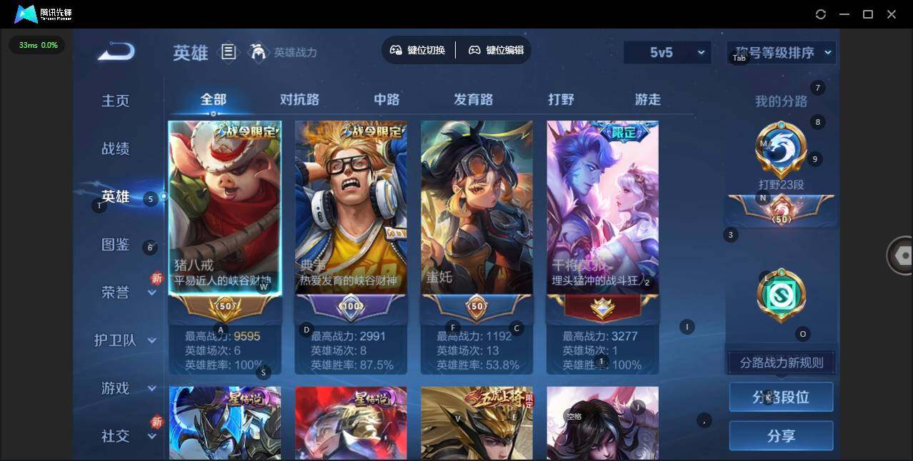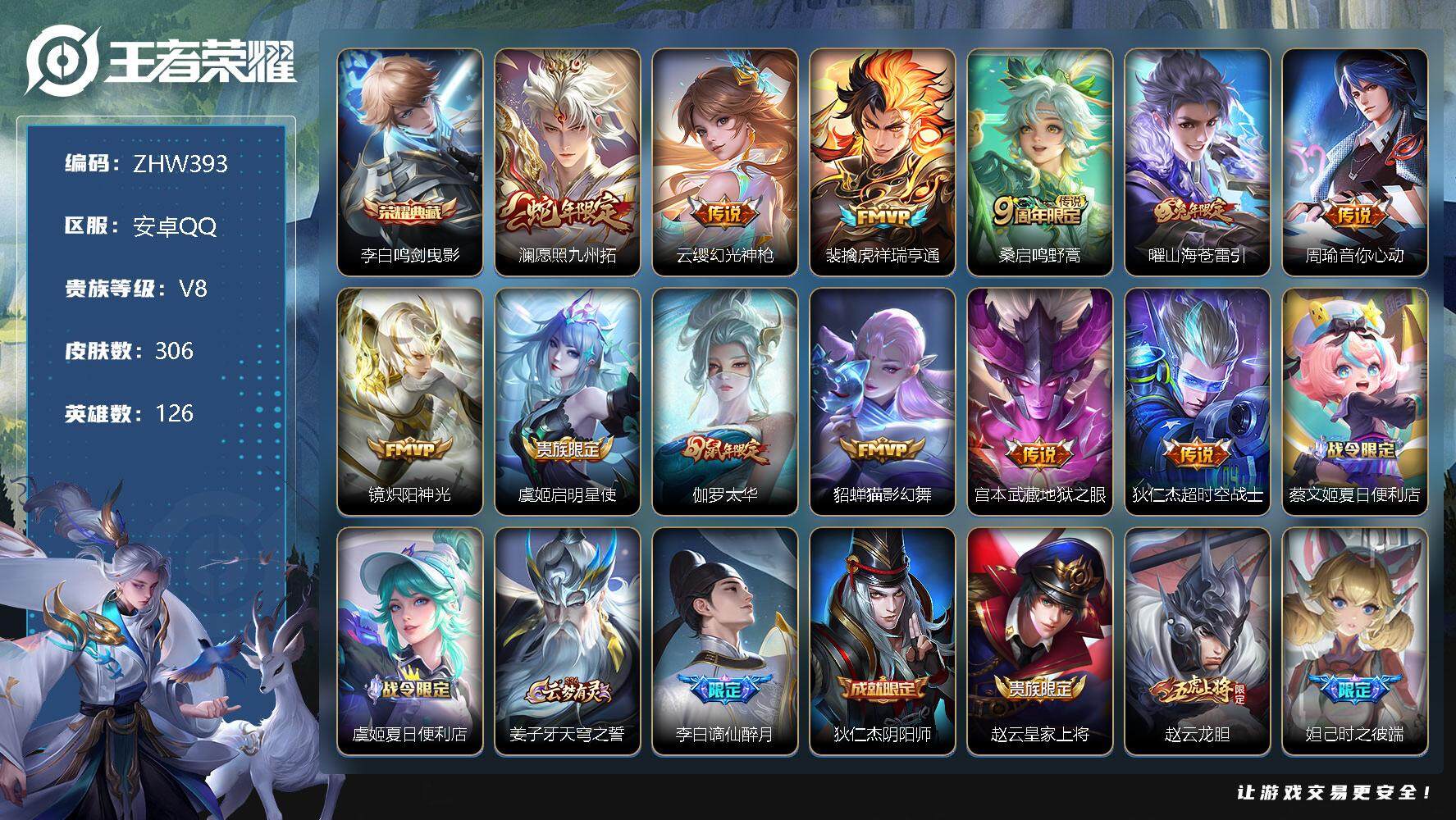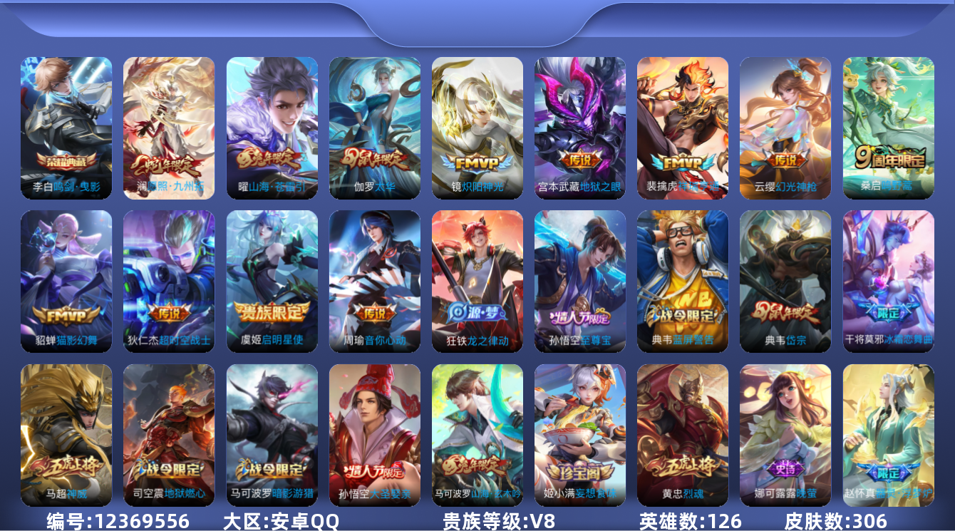 [12369556]【商品标题】:安卓Q-V8-至尊星耀I段位-126英雄-306皮肤-1典藏-12传说-87史诗