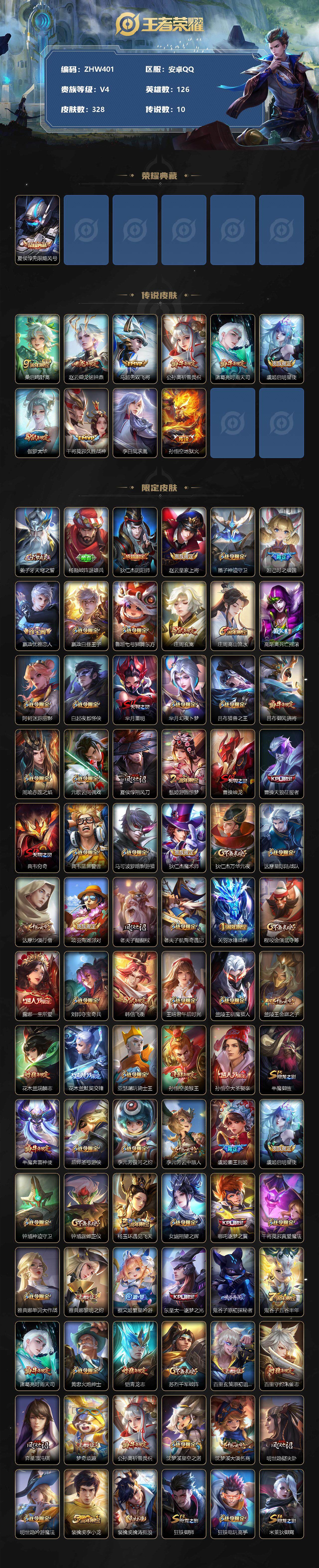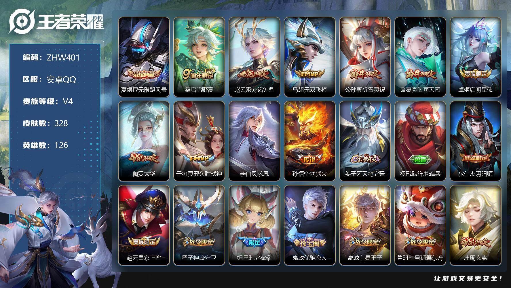 [12369507]【特价急出/详情看图】:安卓Q-V4-永恒钻石III段位-126英雄-328皮肤-1典藏-10传说-100史诗