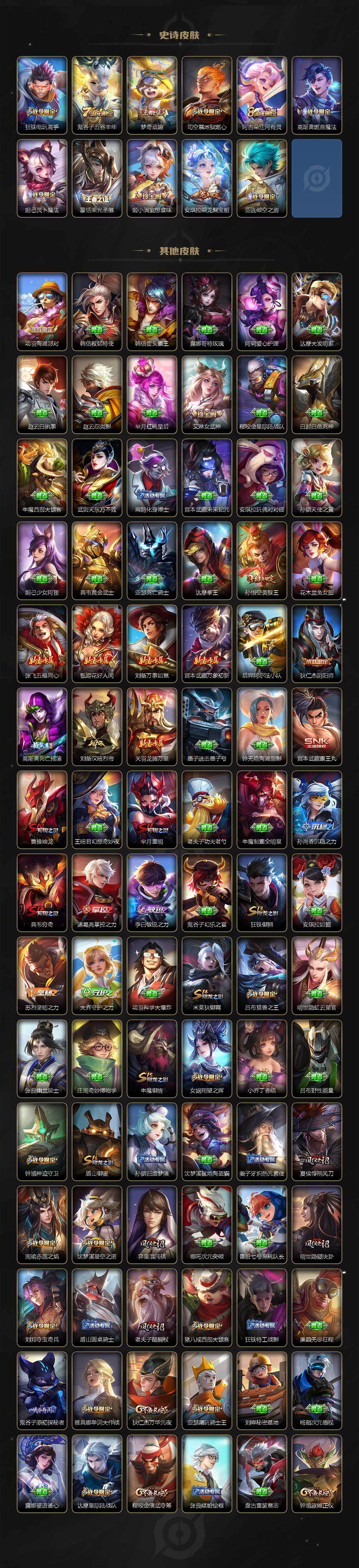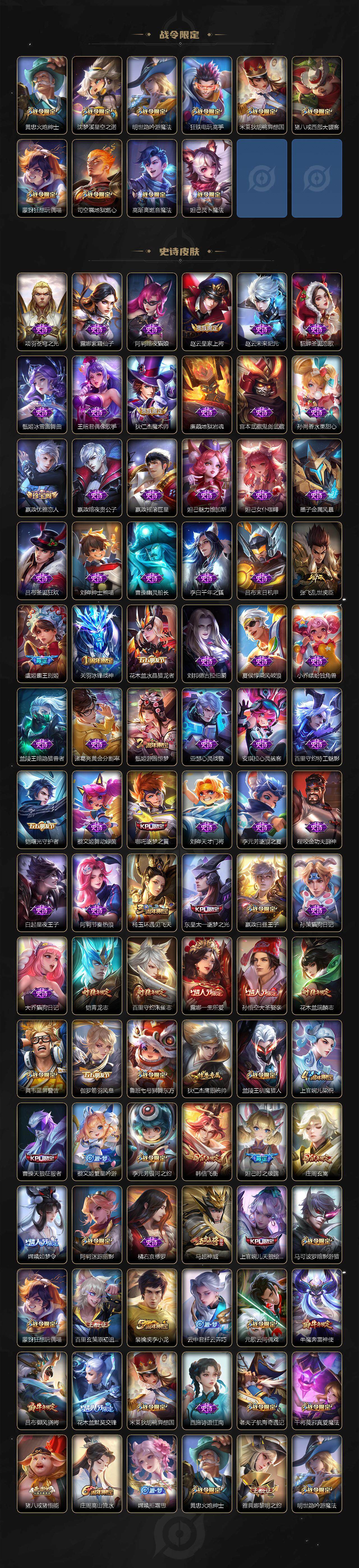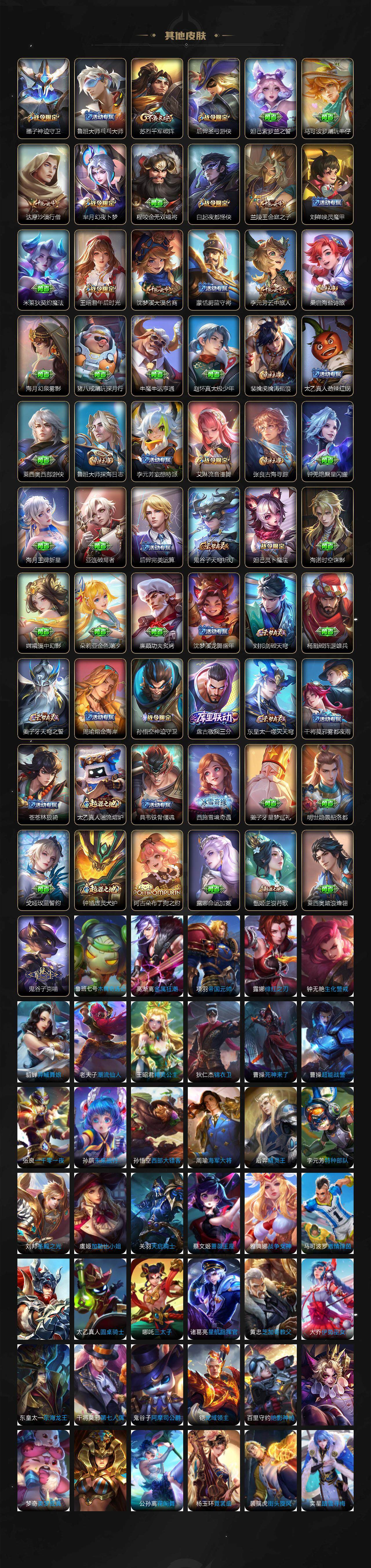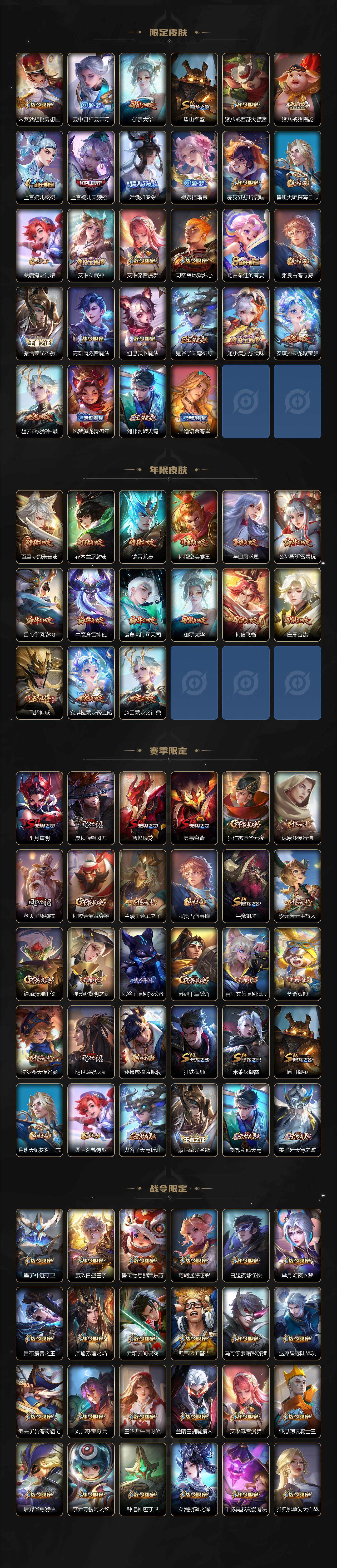 【限定皮肤】:姜子牙天穹之誓,杨戬破阵退雄兵,狄仁杰阴阳师,赵云皇家上将,墨子神迹守卫,妲己时之彼端,嬴政优雅恋人,嬴政白昼王子,鲁班七号狮舞东方,庄周玄嵩,庄周高山流水,高渐离死亡摇滚,阿轲迷踪丽影,白起夜都怪侠,芈月重明,芈月幻夜卜梦,吕布猎兽之王,吕布御风骁将,周瑜赤莲之焰,元歌云间偶戏,夏侯惇朔风刀,甄姬游园惊梦,曹操烛龙,曹操天狼征服者,典韦穷奇,典韦蓝屏警告,马可波罗暗影游猎,狄仁杰魔术师,狄仁杰万华元夜,达摩星际陆战队,达摩沙漠行僧,项羽海滩派对,老夫子醍醐杖,老夫子航海奇遇记,关羽冰锋战神,程咬金演武夺筹,露娜一生所爱,刘邦夺宝奇兵,韩信飞衡,王昭君午后时光,兰陵王驯魔猎人,兰陵王金庭之子,花木兰瑞麟志,花木兰默契交锋,亚瑟潮玩骑士王,孙悟空美猴王,孙悟空大圣娶亲,牛魔御旌,牛魔奔雷神使,后羿圣弓游侠,李元芳银河之约,李元芳云中旅人,虞姬霸王别姬,虞姬启明星使,钟馗神迹守卫,钟馗驱傩正仪,杨玉环遇见飞天,女娲朔望之晖,哪吒逐梦之翼,干将莫邪真爱魔法,雅典娜单词大作战,雅典娜黎明之约,蔡文姬繁星吟游,东皇太一逐梦之光,鬼谷子原初探秘者,鬼谷子五谷丰年,诸葛亮时雨天司,黄忠火炮绅士,铠青龙志,苏烈千军破阵,百里玄策原初追逐者,百里守约朱雀志,弈星混沌棋,梦奇顽趣,公孙离祈雪灵祝,沈梦溪星空之诺,沈梦溪大漠名商,明世隐疑决卦,明世隐吟游魔法,裴擒虎李小龙,裴擒虎擒涛扼浪,狂铁御狮,狂铁电玩高手,米莱狄御霄,米莱狄胡桃异想国,云中君纤云弄巧,伽罗太华,盾山御銮,猪八戒西部大镖客,猪八戒猪悟能,上官婉儿梁祝,上官婉儿天狼绘梦者,嫦娥如梦令,嫦娥拒霜思,蒙犽狂想玩偶喵,鲁班大师探海日志,桑启海盐诗旅,艾琳女武神,艾琳流音漫舞,司空震地狱燃心,阿古朵江河有灵,张良古海寻踪,蒙恬荣光圣徽,高渐离燃音魔法,妲己灵卜魔法,鬼谷子天穹祈灯,姬小满妄想食味,安琪拉乘龙聚宝船,赵云乘龙铭钟鼎,沈梦溪龙舞盛年,刘邦剑破天穹,周瑜熔金海岸