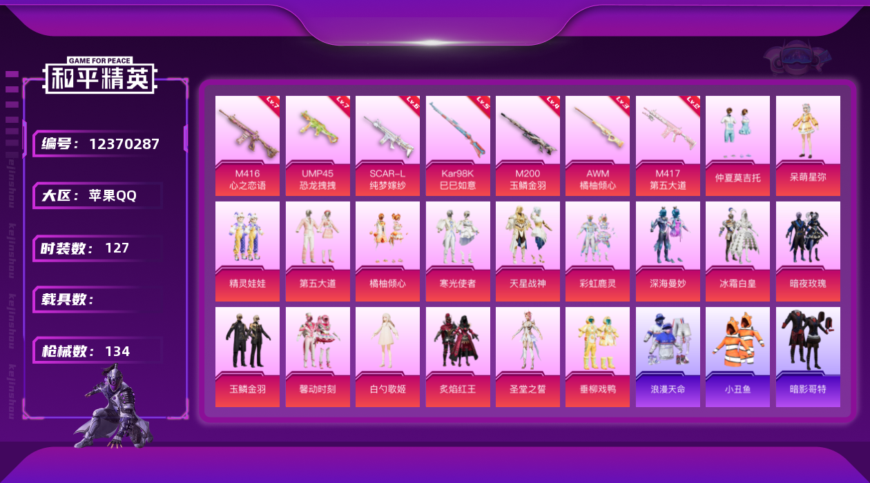 [12370287]【商品标题】:苹果 手Q-17粉装-8特效枪-0载具-3粉色飞行器-53470热力值-12王牌印记-127套装-134枪皮