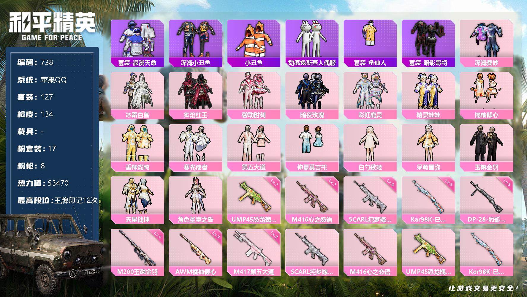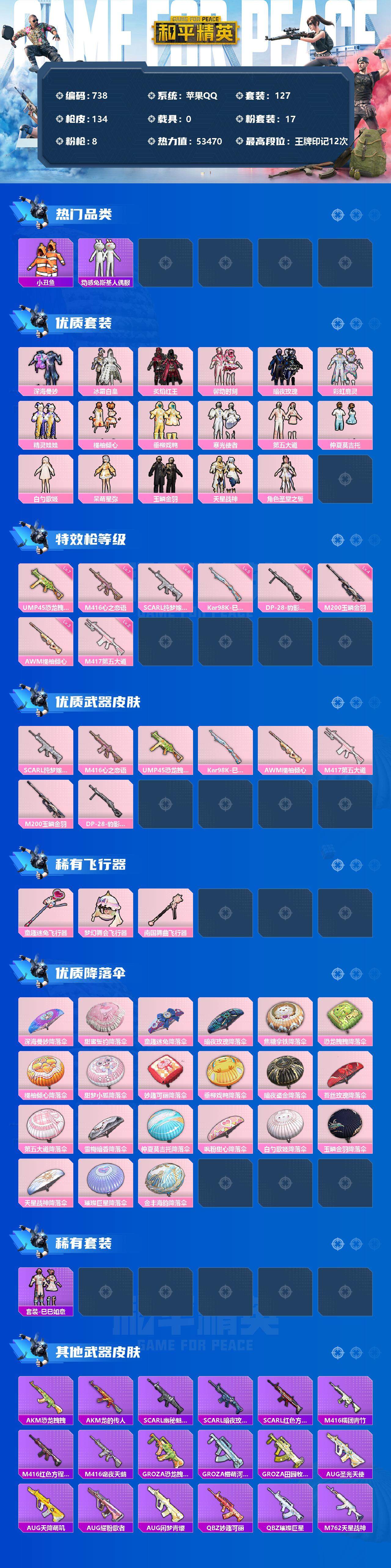 [12370287]【商品标题】:苹果 手Q-17粉装-8特效枪-0载具-3粉色飞行器-53470热力值-12王牌印记-127套装-134枪皮 【热门品类】:套装-浪漫天命,套装-深海小丑鱼,套装-小丑鱼,套装-动感兔斯基人偶服,套装-龟仙人,套装-暗影哥特 【粉色套装】:粉装-深海曼妙,粉装-冰霜白皇,粉装-炙焰红王,粉装-馨动时刻,粉装-暗夜玫瑰,粉装-彩虹鹿灵,粉装-精灵娃娃,粉装-橘柚倾心,粉装-垂柳戏鸭,粉装-寒光使者,粉装-第五大道,粉装-仲夏莫吉托,角色-白勺歌姬,角色-呆萌星弥,粉装-玉鳞金羽,粉装-天星战神,角色-圣堂之誓 【粉色枪皮等级】:SCAR-L-纯梦嫁纱(六级),M416-心之恋语(七级),UMP45-恐龙拽拽(七级),Kar98K-巳巳如意(五级),AWM-橘柚倾心(三级),M417-第五大道(二级),M200-玉鳞金羽(四级),DP-28-豹影疾电(五级) 【粉色枪皮】:SCAR-L-纯梦嫁纱,M416-心之恋语,UMP45-恐龙拽拽,Kar98K-巳巳如意,AWM-橘柚倾心,M417-第五大道,M200-玉鳞金羽,DP-28-豹影疾电 【粉色飞行器】:童趣迷兔飞行器,梦幻舞会飞行器,南国舞曲飞行器 【粉色降落伞】:深海曼妙降落伞,甜蜜誓约降落伞,童趣迷兔降落伞,暗夜玫瑰降落伞,焦糖拿铁降落伞,恐龙拽拽降落伞,橘柚倾心降落伞,甜梦小狐降落伞,妙趣可丽降落伞,垂柳戏鸭降落伞,暗夜鎏金降落伞,苔丝玫瑰降落伞,第五大道降落伞,雪梅暗香降落伞,仲夏莫吉托降落伞,飒粉甜心降落伞,白勺歌姬降落伞,玉鳞金羽降落伞,天星战神降落伞,璀璨巨星降落伞,金丰海韵降落伞 【稀有套装】:套装-龟仙人,套装-巳巳如意 【稀有枪皮】:AKM-恐龙拽拽,AKM-龙的传人,SCAR-L-幽秘魅影,SCAR-L-暗夜玫瑰,SCAR-L-红色方程式,M416-糯团青竹,M416-红色方程式,M416-诡夜天鹅,GROZA-恐龙拽拽,GROZA-懵萌河马,GROZA-田园牧歌,AUG-圣光天使,AUG-天降萌叽,AUG-耀粉歌者,AUG-闲梦青缨,QBZ-妙趣可丽,QBZ-璀璨巨星,M762-天星战神,M762-天降萌叽,M762-彩虹符号,M762-橘柚倾心,M762-深海曼妙,M762-第五大道,Mk47-妙红点点,G36C-懵萌河马,G36C-暗夜玫瑰,蜜獾-垂柳戏鸭,蜜獾-天降萌叽,