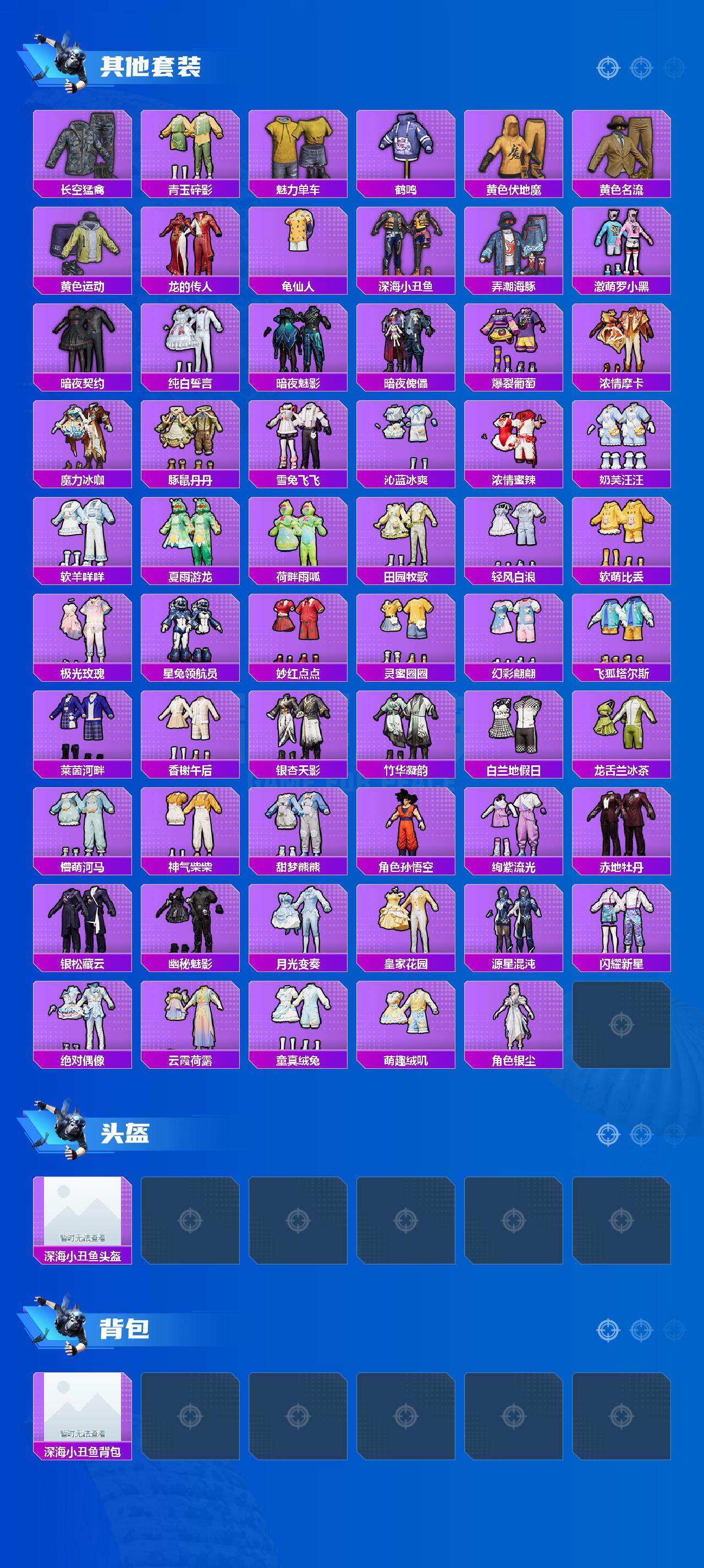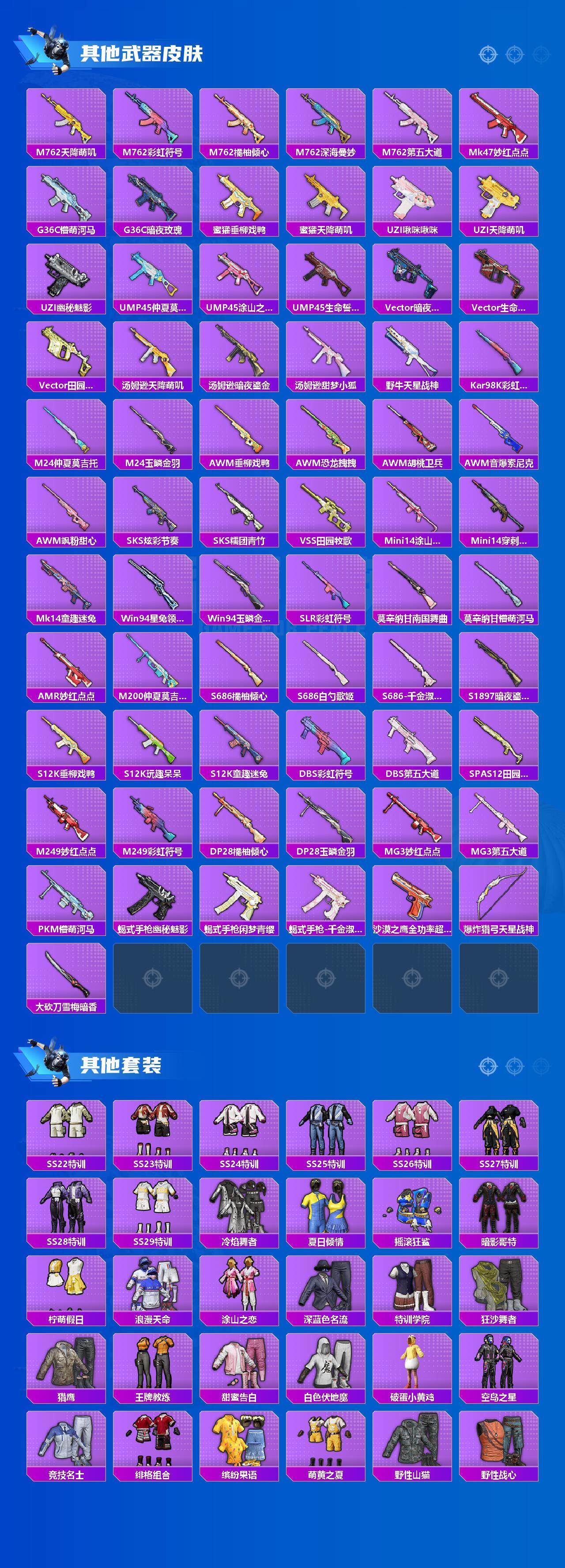- [11553709]1粉装 1特效枪 1载具 10印记 可二次 可修改实名 身法装备:Mark.06(新蓝螳螂) 优质装备:玛莎拉蒂Quattroporte(夜幕蓝),千金淑猫,Kar98K-巳巳如意 热门装扮:暗夜魅影 五级特效枪:五级Kar98K-巳巳如意 紫色装扮:田园牧歌,轻风白浪,和煦暖阳,SS22特训,SS23特训,娇憨猪猪,梦幻奶油,萌趣咩咩,SS21特训,SS31特训套装,人气偶像,冰川特警,冷焰舞者,SS30特训套装,SS33特训套装,青涩时光,时希公主,SS20特训,飞驰魅影,音速流光,极速竞梦,SS19特训,瑞龙福将,团圆交子,SS17特训,沁蓝冰爽,异彩先驱,缤纷焰火,SS18特训,酒红色名流,长空猛禽,霓虹极客,青年教官,蓝彩潮人,蓝色运动,虎虎生威吉莉,街头潮人,麻辣教官,黄色伏地魔,黄色名流,黄色运动,黑色伏地魔,龙的传人,龟仙人,冰河战士,龙魂突击队,蝶变,香桃花海,极速红龙,格斗先锋,橘黑制服,深蓝色名流,幻影武者,夏日音浪,夜莺强袭者,完美偶像,帅气教官,幻世战舞者,探宝勇士,湖蓝色名流,绮丽涂鸦,白色伏地魔,破晓战魂,破蛋小黄鸡,福星高照,空投萌叽,竞技达人朋克,红色运动,灼焰舞者,炫蓝之夏,牛气满满,猛禽,猎鹰,SS29特训,湖畔霞光,星途旅人,创世·幻影,纯真浪花,热情海星,曼妙人鱼,SS28特训,Mark.06(新蓝螳螂),鱼渊荷华,玉兔迎春,燕燕于飞,巳巳如意,竞技名士,街头风暴,怀庆长公主,SS24特训(SS24特训套装),SS25特训,淡雅花蕊,耀粉歌者,蓝冰羽,紫幽梦,SS32特训服(SS32特训套装),风舞幻音,白糯汤圆,恋语绒绒,光之冒险 优质战备:守护天翼降落伞,星途旅人降落伞,庄周梦蝶降落伞,千金淑猫降落伞,圣域龙灵降落伞,圣域金龙飞行器,雪月幻音降落伞,筑梦精灵降落伞,旋转彩虹降落伞,暗夜玫瑰降落伞
