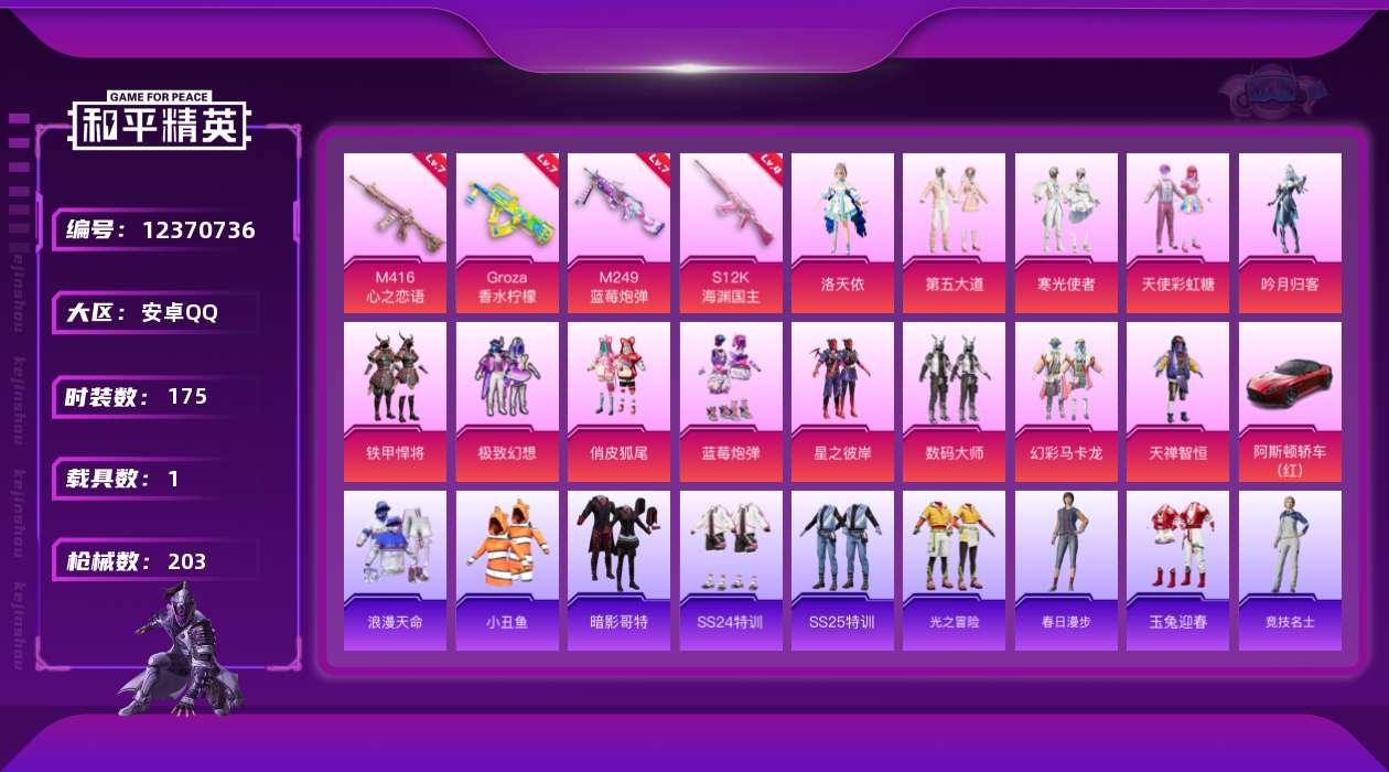 - PX_2065993- 安卓手Q-3王牌印记-9粉装-8特效枪-1载具-55771热力值-112套装-176枪皮-1卓越印记-0传奇印记 【9粉装】,梦幻火箭,初号机款机体服,智耀战神,光极星,玩偶服-猪猪侠,暖暖奶龙,紫电风暴,琉璃脉冲,吟月归客 【8特效枪】AKM-炫紫旋律-5级 SCAR-L-梦幻火箭-4级 M416-风花雪月-7级 GROZA-镜光银凌-4级 M762-青锋波束-5级 Ka