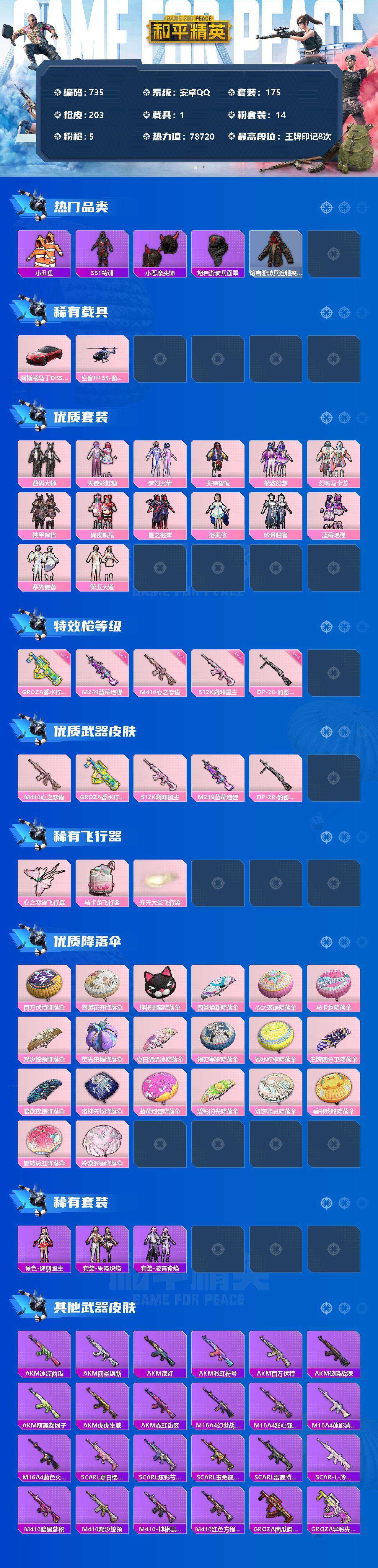 [12370736]【商品标题】:安卓 手Q-14粉装-5特效枪-1载具-3粉色飞行器-78720热力值-8王牌印记-175套装-203枪皮 【热门品类】:粉装-梦幻火箭,套装-浪漫天命,套装-小丑鱼,套装-SS1特训,套装-龟仙人,套装-潮萌小黄鸭,套装-暗影哥特,小恶魔头饰,熔岩游骑兵面罩,熔岩游骑兵连帽夹克 【粉色载具】:阿斯顿马丁DBS(红),空客H135-蔚蓝之翼 【粉色套装】:粉装-数码大师,粉装-天使彩虹糖,粉装-梦幻火箭,粉装-天禅智恒,粉装-极致幻想,粉装-幻彩马卡龙,粉装-铁甲悍将,粉装-俏皮狐尾,粉装-星之彼岸,角色-洛天依,粉装-吟月归客,粉装-蓝莓炮弹,粉装-寒光使者,粉装-第五大道 【粉色枪皮等级】:M416-心之恋语(七级),GROZA-香水柠檬(七级),S12K-海渊国主(四级),M249-蓝莓炮弹(七级),DP-28-豹影疾电(四级) 【粉色枪皮】:M416-心之恋语,GROZA-香水柠檬,S12K-海渊国主,M249-蓝莓炮弹,DP-28-豹影疾电 【粉色飞行器】:心之恋语飞行翼,马卡龙飞行器,齐天大圣飞行器 【粉色降落伞】:百万伏特降落伞,春暖花开降落伞,神秘黑猫降落伞,四圣焕新降落伞,心之恋语降落伞,马卡龙降落伞,潮汐统领降落伞,荧光虫舞降落伞,夏日绵绵冰降落伞,银刃赛罗降落伞,香水柠檬降落伞,王牌四分卫降落伞,暗夜玫瑰降落伞,洛神天依降落伞,蓝莓炮弹降落伞,碧影闪光降落伞,筑梦精灵降落伞,垂柳戏鸭降落伞,旋转彩虹降落伞,冷漠罗丽降落伞 【稀有套装】:套装-龟仙人,角色-绛羽幽主,套装-朱霞炽焰,套装-凌霄紫焰 【稀有枪皮】:AKM-冰凉西瓜,AKM-四圣焕新,AKM-夜灯,AKM-彩虹符号,AKM-百万伏特,AKM-破晓战魂,AKM-萌趣颜团子,AKM-虎虎生威,AKM-霓虹街区,M16A4-幻世战舞者,M16A4-甜心亚梦,M16A4-莲影清波,M16A4-蓝色火焰,SCAR-L-夏日绵绵冰,SCAR-L-炫彩节奏,SCAR-L-玉兔迎春,SCAR-L-雷霆特警,SCAR-L-冷漠罗丽,M416-暗星紫秘,M416-潮汐统领,M416-神秘黑猫,M416-红色方程式,GROZA-南瓜骑士,GROZA-异彩先驱,GROZA-彩虹符号,GROZA-治愈之星,GROZA-生命誓言,GROZA-田园牧歌,GROZA-蓝莓炮弹,GROZA-马卡龙,G