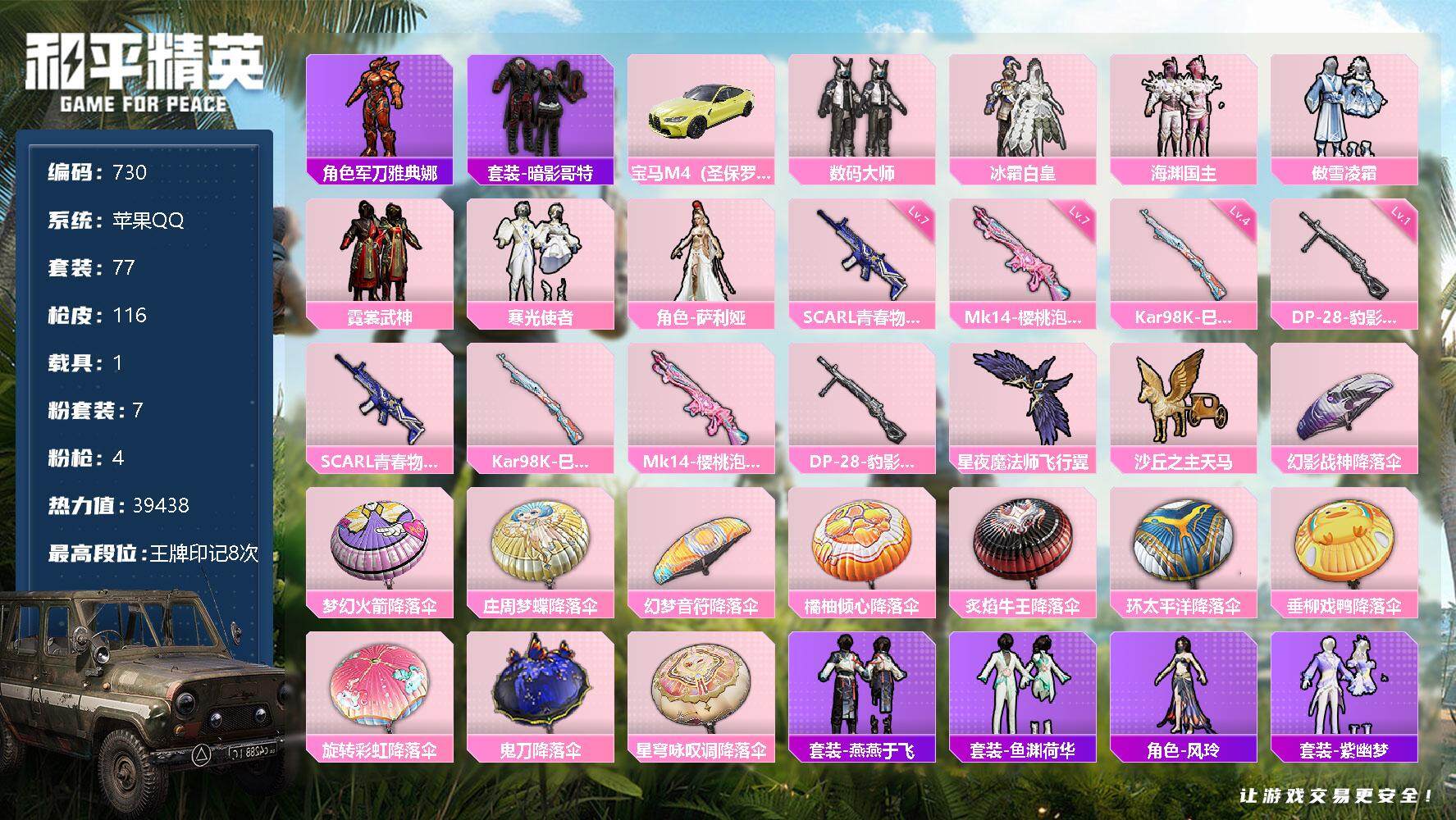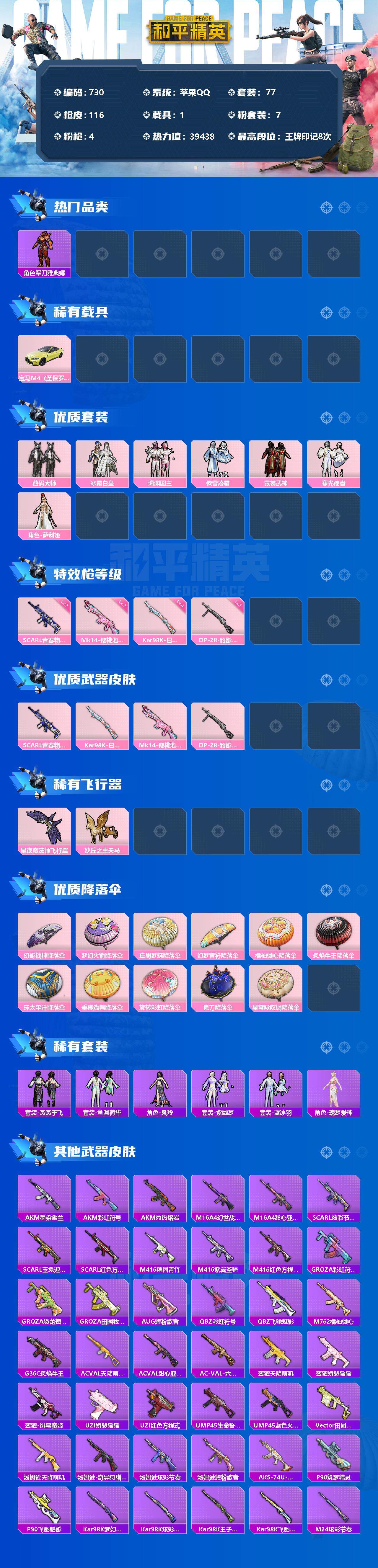 [12371334]【商品标题】:苹果 手Q-7粉装-4特效枪-1载具-2粉色飞行器-39438热力值-8王牌印记-77套装-116枪皮 【热门品类】:角色-军刀雅典娜,套装-暗影哥特 【粉色载具】:宝马M4(圣保罗黄) 【粉色套装】:粉装-数码大师,粉装-冰霜白皇,粉装-海渊国主,粉装-傲雪凌霜,粉装-霓裳武神,粉装-寒光使者,角色-萨利娅 【粉色枪皮等级】:SCAR-L-青春物语(七级),Kar98K-巳巳如意(四级),Mk14-樱桃泡泡(七级),DP-28-豹影疾电(一级) 【粉色枪皮】:SCAR-L-青春物语,Kar98K-巳巳如意,Mk14-樱桃泡泡,DP-28-豹影疾电 【粉色飞行器】:星夜魔法师飞行翼,沙丘之主天马 【粉色降落伞】:幻影战神降落伞,梦幻火箭降落伞,庄周梦蝶降落伞,幻梦音符降落伞,橘柚倾心降落伞,炙焰牛王降落伞,环太平洋降落伞,垂柳戏鸭降落伞,旋转彩虹降落伞,鬼刀降落伞,星穹咏叹调降落伞 【稀有套装】:套装-燕燕于飞,套装-鱼渊荷华,角色-风玲,套装-紫幽梦,套装-蓝冰羽,角色-瑰梦爱神 【稀有枪皮】:AKM-墨染幽兰,AKM-彩虹符号,AKM-灼热熔岩,M16A4-幻世战舞者,M16A4-甜心亚梦,SCAR-L-炫彩节奏,SCAR-L-玉兔迎春,SCAR-L-红色方程式,M416-糯团青竹,M416-紫翼圣骑,M416-红色方程式,GROZA-彩虹符号,GROZA-恐龙拽拽,GROZA-田园牧歌,AUG-耀粉歌者,QBZ-彩虹符号,QBZ-飞驰魅影,M762-橘柚倾心,G36C-炙焰牛王,AC-VAL-天降萌叽,AC-VAL-甜心亚梦,AC-VAL-六号稻草人,蜜獾-天降萌叽,蜜獾-娇憨猪猪,蜜獾-绯穹魔姬,UZI-娇憨猪猪,UZI-红色方程式,UMP45-生命誓言,UMP45-蓝色火焰,Vector-田园牧歌,汤姆逊-天降萌叽,汤姆逊-奇异狩猎者,汤姆逊-炫彩节奏,汤姆逊-耀粉歌者,AKS-74U-鬼刀,P90-筑梦精灵,P90-飞驰魅影,Kar98K-梦幻火箭,Kar98K-炫彩节奏,Kar98K-王子的夏天,Kar98K-飞驰魅影,M24-炫彩节奏,M24-幻彩电音,AWM-炙焰牛王,AWM-超新星,AWM-飒粉甜心,SKS-炫彩节奏,VSS-田园牧歌,Mini14-梦幻火箭,Mini14-炫彩节奏,Mini14-耀粉歌者,SLR-娇憨猪猪,莫辛纳