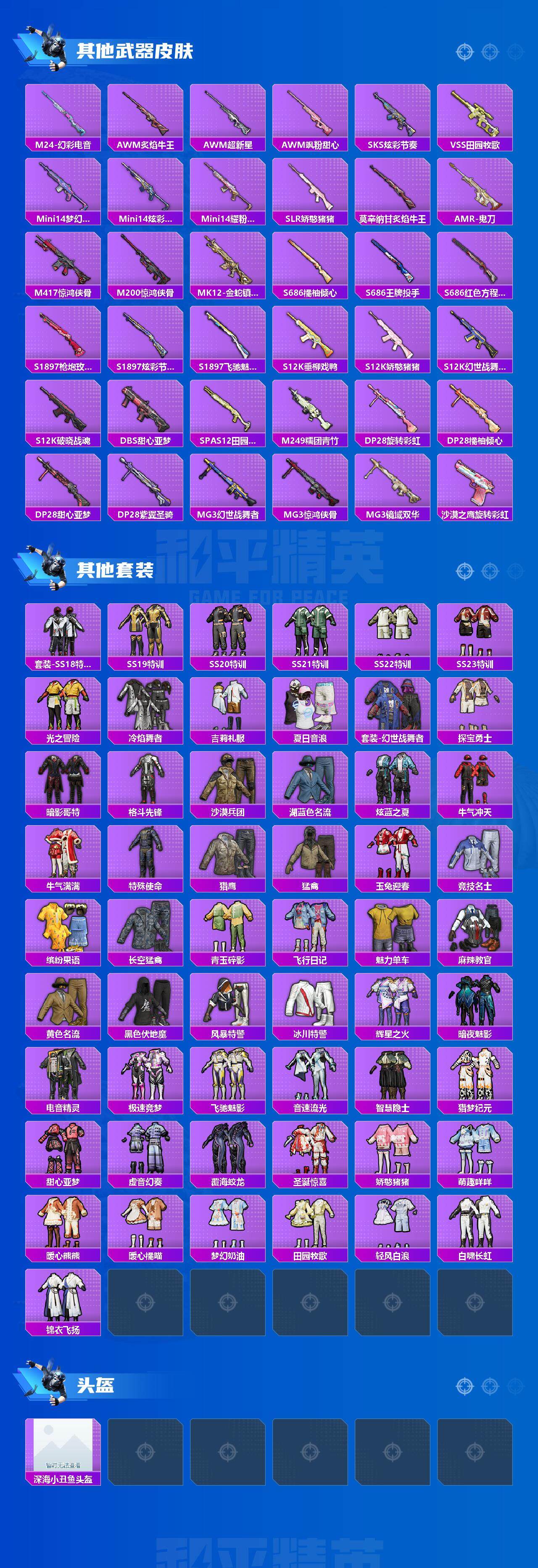 【稀有枪皮】:AKM-墨染幽兰,AKM-彩虹符号,AKM-灼热熔岩,M16A4-幻世战舞者,M16A4-甜心亚梦,SCAR-L-炫彩节奏,SCAR-L-玉兔迎春,SCAR-L-红色方程式,M416-糯团青竹,M416-紫翼圣骑,M416-红色方程式,GROZA-彩虹符号,GROZA-恐龙拽拽,GROZA-田园牧歌,AUG-耀粉歌者,QBZ-彩虹符号,QBZ-飞驰魅影,M762-橘柚倾心,G36C-炙焰牛王,AC-VAL-天降萌叽,AC-VAL-甜心亚梦,AC-VAL-六号稻草人,蜜獾-天降萌叽,蜜獾-娇憨猪猪,蜜獾-绯穹魔姬,UZI-娇憨猪猪,UZI-红色方程式,UMP45-生命誓言,UMP45-蓝色火焰,Vector-田园牧歌,汤姆逊-天降萌叽,汤姆逊-奇异狩猎者,汤姆逊-炫彩节奏,汤姆逊-耀粉歌者,AKS-74U-鬼刀,P90-筑梦精灵,P90-飞驰魅影,Kar98K-梦幻火箭,Kar98K-炫彩节奏,Kar98K-王子的夏天,Kar98K-飞驰魅影,M24-炫彩节奏,M24-幻彩电音,AWM-炙焰牛王,AWM-超新星,AWM-飒粉甜心,SKS-炫彩节奏,VSS-田园牧歌,Mini14-梦幻火箭,Mini14-炫彩节奏,Mini14-耀粉歌者,SLR-娇憨猪猪,莫辛纳