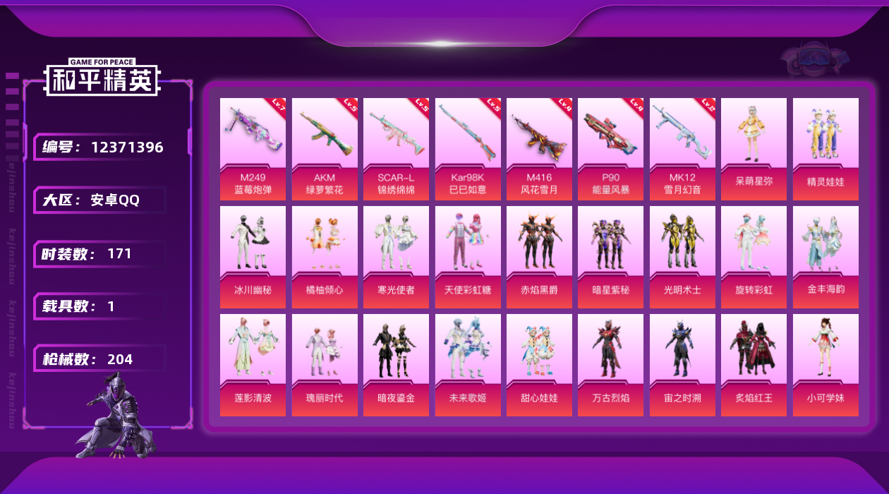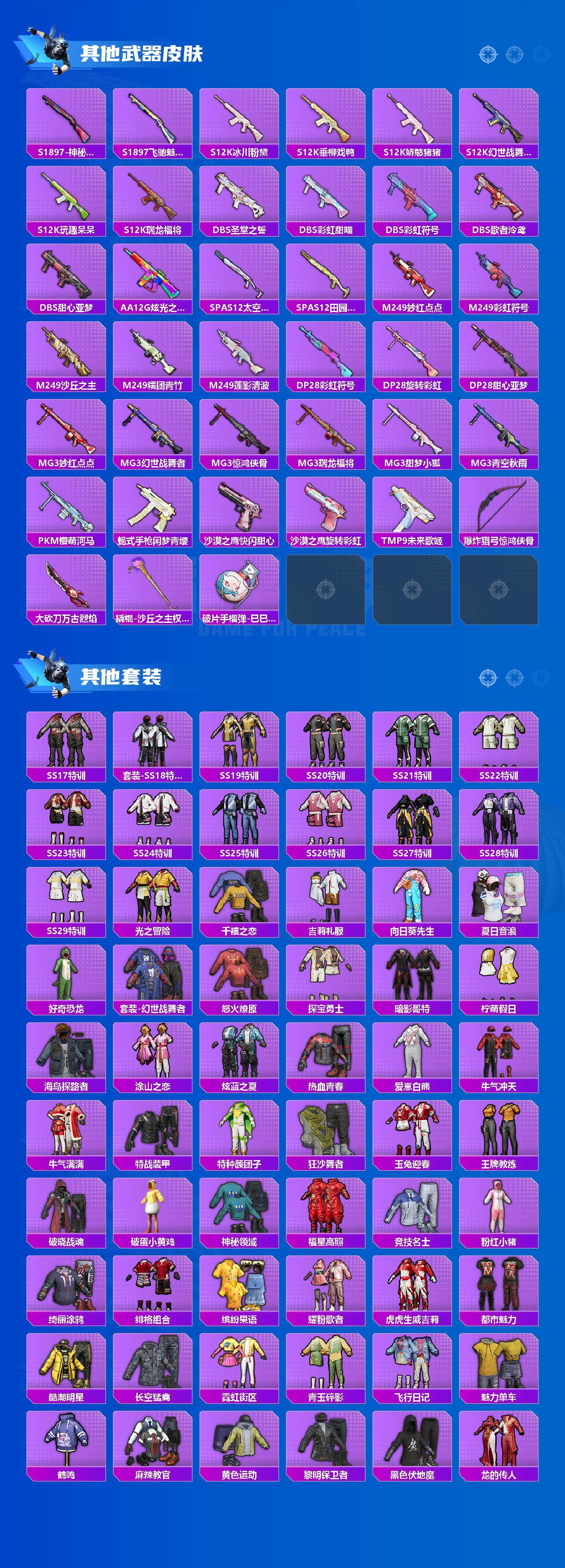 - PX_2058102- 苹果手Q-18王牌印记-有战神框-3粉装-6特效枪-0载具-71356热力值-168套装-218枪皮-3卓越印记-1传奇印记 【3粉装】,梦幻火箭,蝶舞迷情,幻彩电音 【6特效枪】SCAR-L-梦幻火箭-7级 M416-心之恋语-7级 M762-激战未来-7级 Kar98K-巳巳如意-5级 UZI-筑梦精灵-7级 M249-蓝莓炮弹-7级 【5稀有紫装】,都市猎人,派对舞