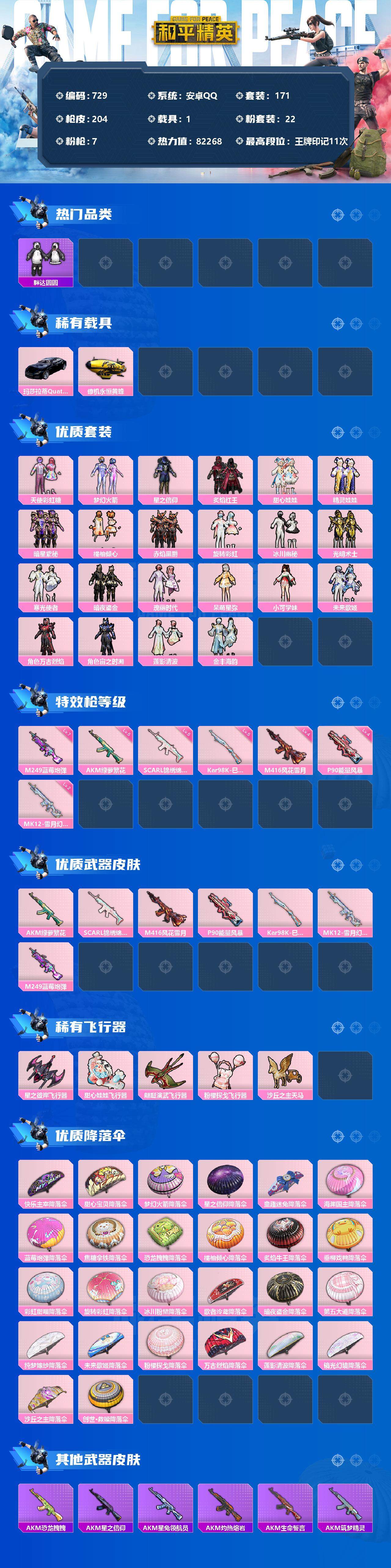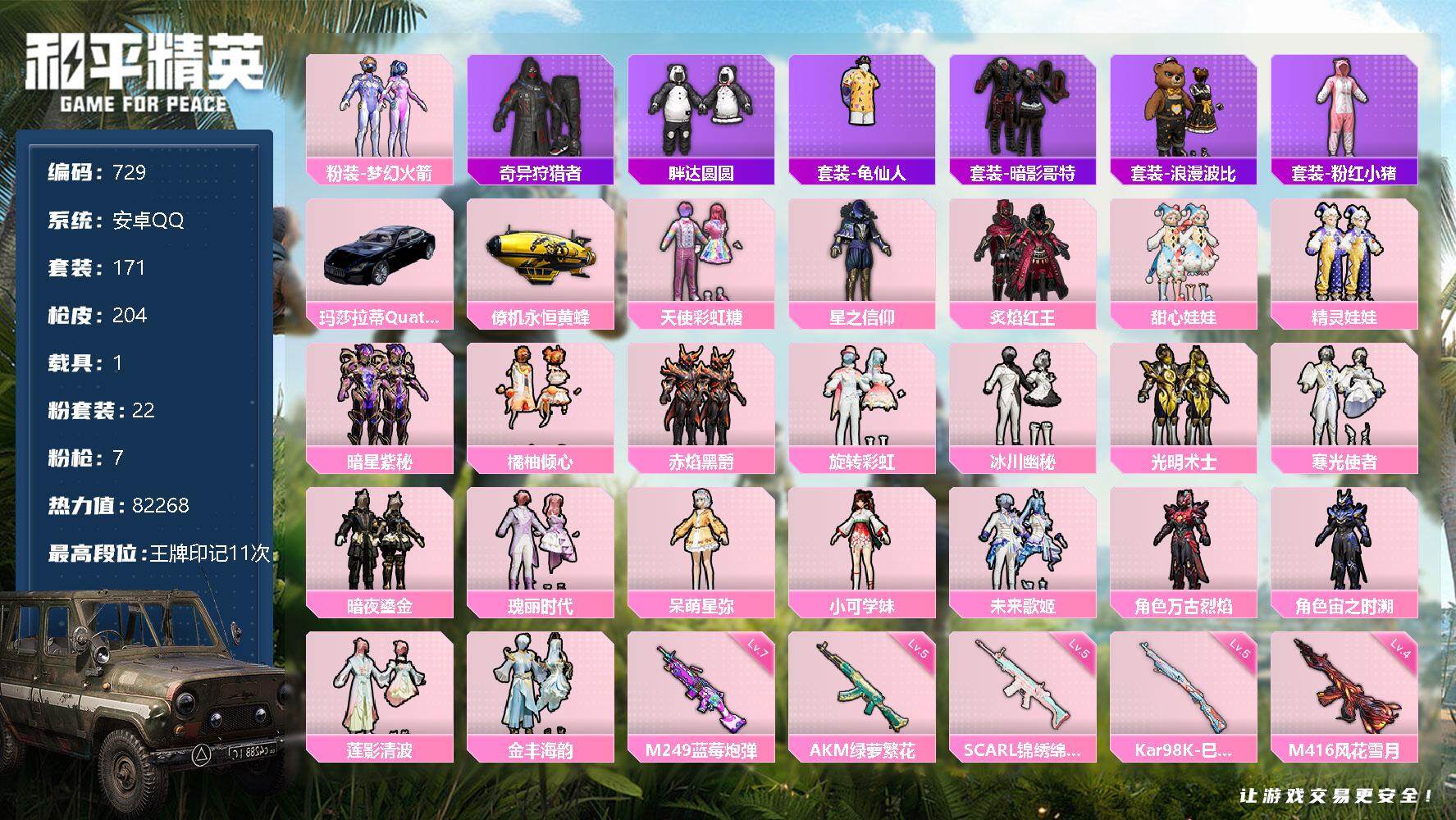 [12371396]【商品标题】:安卓 手Q-22粉装-7特效枪-1载具-5粉色飞行器-82268热力值-11王牌印记-171套装-204枪皮