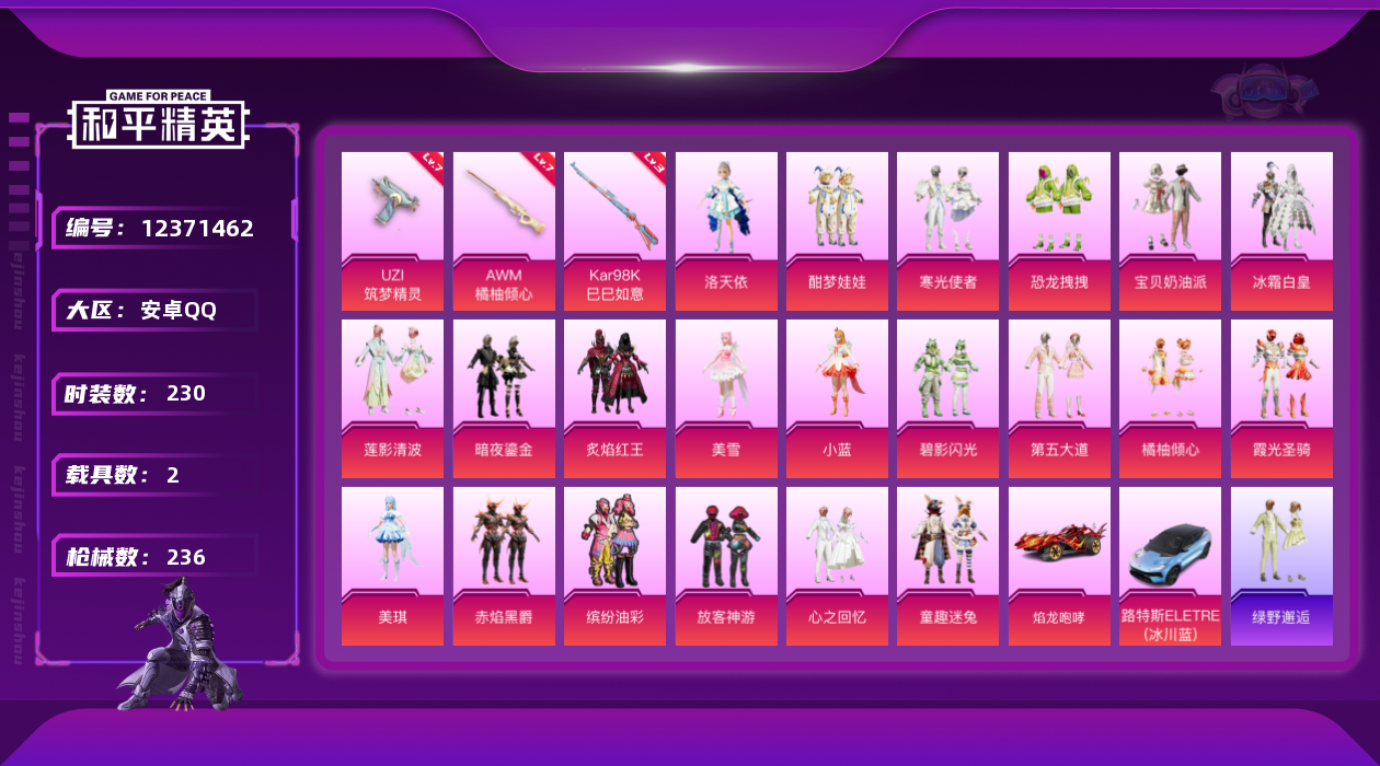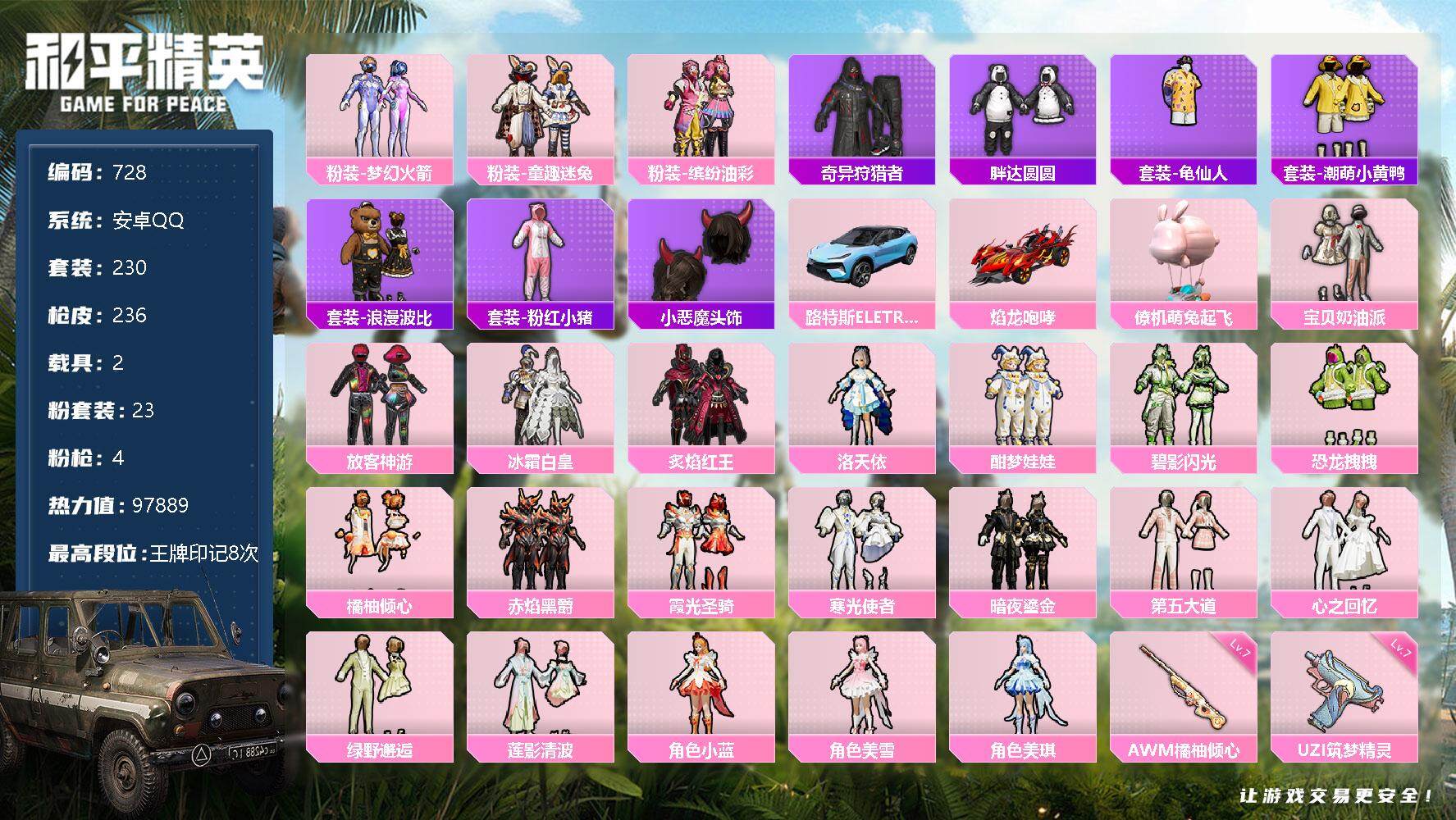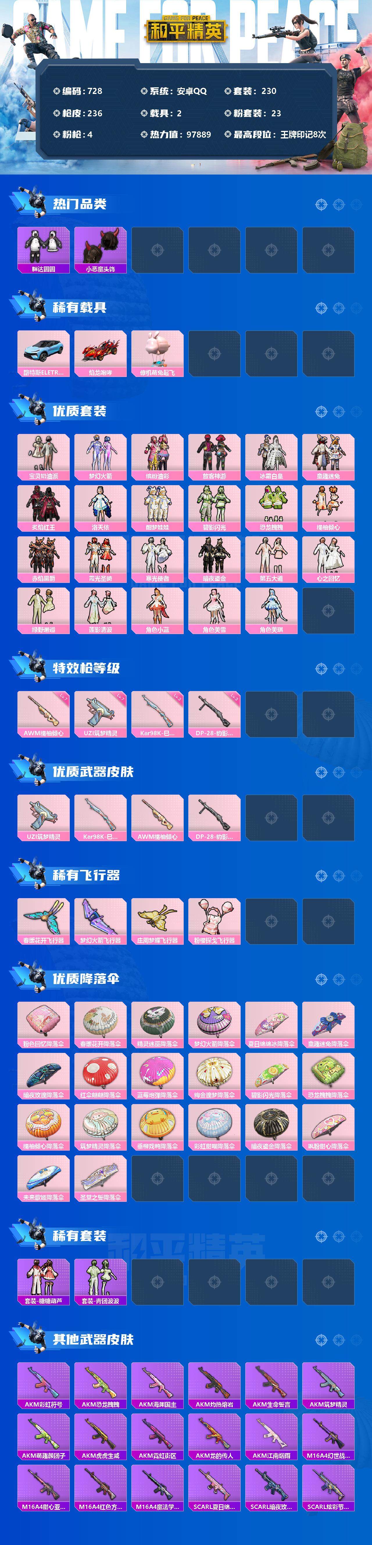 [12371462]【商品标题】:安卓 手Q-23粉装-4特效枪-2载具-4粉色飞行器-97889热力值-8王牌印记-230套装-236枪皮 【热门品类】:粉装-梦幻火箭,粉装-童趣迷兔,粉装-缤纷油彩,套装-奇异狩猎者,套装-胖达圆圆,套装-龟仙人,套装-潮萌小黄鸭,套装-浪漫波比,套装-粉红小猪,小恶魔头饰 【粉色载具】:路特斯ELETRE(冰川蓝),焰龙咆哮,僚机-萌兔起飞 【粉色套装】:粉装-宝贝奶油派,粉装-梦幻火箭,粉装-缤纷油彩,粉装-放客神游,粉装-冰霜白皇,粉装-童趣迷兔,粉装-炙焰红王,角色-洛天依,粉装-酣梦娃娃,粉装-碧影闪光,粉装-恐龙拽拽,粉装-橘柚倾心,粉装-赤焰黑爵,粉装-霞光圣骑,粉装-寒光使者,粉装-暗夜鎏金,粉装-第五大道,粉装-心之回忆,粉装-绿野邂逅,粉装-莲影清波,角色-小蓝,角色-美雪,角色-美琪 【粉色枪皮等级】:UZI-筑梦精灵(七级),Kar98K-巳巳如意(三级),AWM-橘柚倾心(七级),DP-28-豹影疾电(三级) 【粉色枪皮】:UZI-筑梦精灵,Kar98K-巳巳如意,AWM-橘柚倾心,DP-28-豹影疾电 【粉色飞行器】:春暖花开飞行器,梦幻火箭飞行器,庄周梦蝶飞行器,粉樱探戈飞行器 【粉色降落伞】:粉色回忆降落伞,春暖花开降落伞,精灵迷巫降落伞,梦幻火箭降落伞,夏日绵绵冰降落伞,童趣迷兔降落伞,暗夜玫瑰降落伞,红伞翩翩降落伞,蓝莓炮弹降落伞,绚金瑰梦降落伞,碧影闪光降落伞,恐龙拽拽降落伞,橘柚倾心降落伞,筑梦精灵降落伞,垂柳戏鸭降落伞,彩虹甜喵降落伞,暗夜鎏金降落伞,飒粉甜心降落伞,未来歌姬降落伞,圣堂之誓降落伞 【稀有套装】:套装-龟仙人,套装-糖糖葫芦,套装-青团波波 【稀有枪皮】:AKM-彩虹符号,AKM-恐龙拽拽,AKM-江南烟雨,AKM-海渊国主,AKM-灼热熔岩,AKM-生命誓言,AKM-筑梦精灵,AKM-萌趣颜团子,AKM-虎虎生威,AKM-霓虹街区,AKM-龙的传人,M16A4-幻世战舞者,M16A4-甜心亚梦,M16A4-红色方程式,M16A4-魔法学院,SCAR-L-夏日绵绵冰,SCAR-L-暗夜玫瑰,SCAR-L-炫彩节奏,SCAR-L-玉兔迎春,SCAR-L-生命誓言,SCAR-L-碧影闪光,SCAR-L-红色方程式,SCAR-L-银碳小老虎,M416-糯团青竹,M416-紫翼圣骑,M416-红色