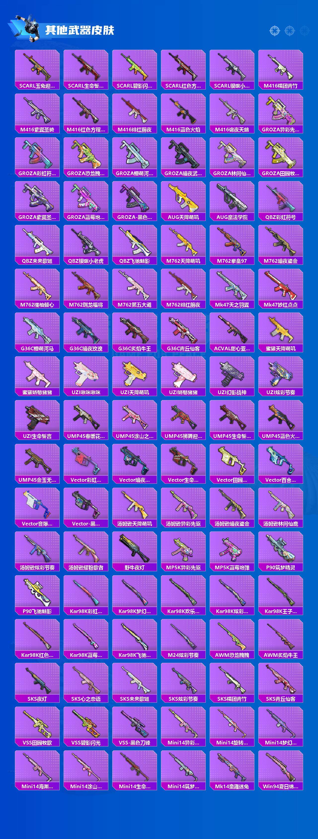 【稀有枪皮】:AKM-彩虹符号,AKM-恐龙拽拽,AKM-江南烟雨,AKM-海渊国主,AKM-灼热熔岩,AKM-生命誓言,AKM-筑梦精灵,AKM-萌趣颜团子,AKM-虎虎生威,AKM-霓虹街区,AKM-龙的传人,M16A4-幻世战舞者,M16A4-甜心亚梦,M16A4-红色方程式,M16A4-魔法学院,SCAR-L-夏日绵绵冰,SCAR-L-暗夜玫瑰,SCAR-L-炫彩节奏,SCAR-L-玉兔迎春,SCAR-L-生命誓言,SCAR-L-碧影闪光,SCAR-L-红色方程式,SCAR-L-银碳小老虎,M416-糯团青竹,M416-紫翼圣骑,M416-红色