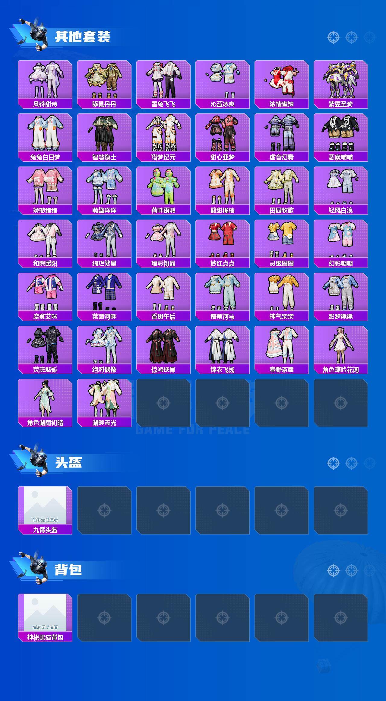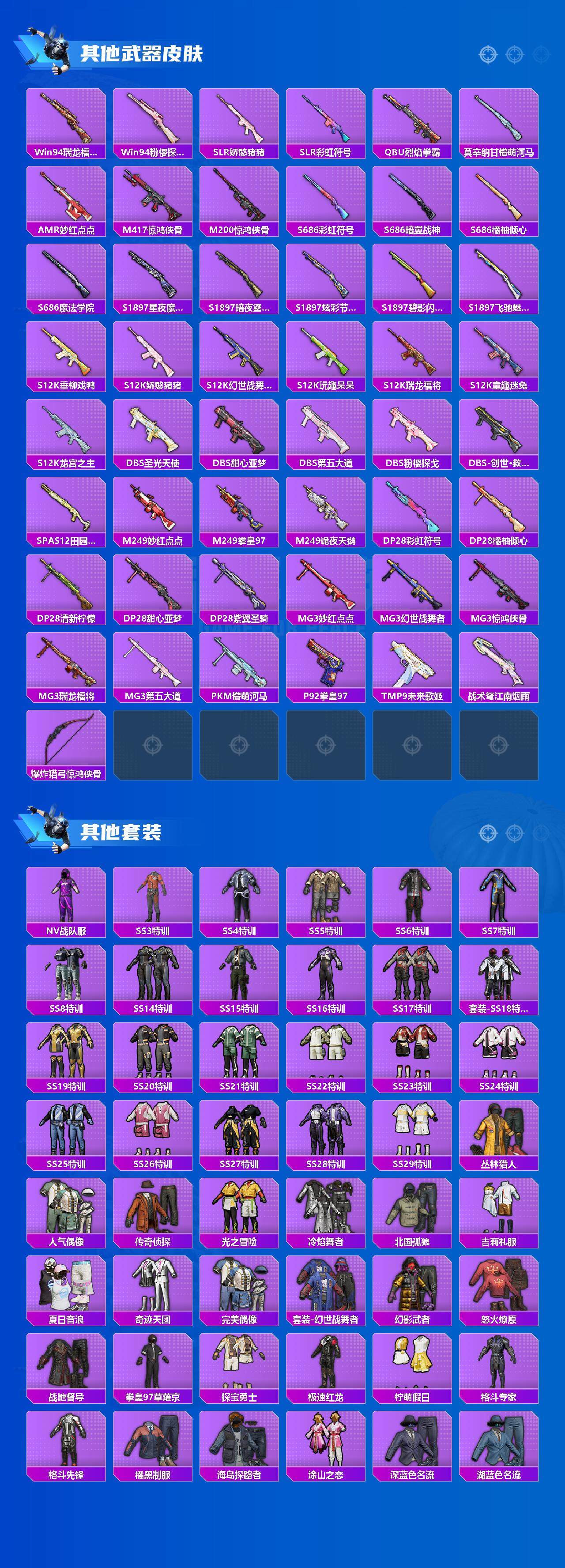 - [12294503]1粉装 1特效枪 可二次 可修改实名 优质装备:草莓生巧,Kar98K-巳巳如意 三级特效枪:三级Kar98K-巳巳如意 紫色装扮:SS23特训,SS31特训套装,SS21特训,SS22特训,北国孤狼,完美偶像,帅气教官,幻世战舞者,SS5特训,治愈之星,科技之星,SS14特训,黄色名流,青年教官,飞行日记,骑行爱好者,魅力单车,鹤鸣,麻辣教官,黄色伏地魔,黄色运动,黑色伏地魔,龙的传人,龟仙人,都市漫游者,都市魅力,酒红色名流,酷萌兔限定,野性战心,长空猛禽,阳光火鸡,雪山精英,街头潮人,深蓝色名流,湖蓝色名流,灰色格斗者,牛气冲天,牛气满满,活力之心,橘黑制服,竞技达人朋克,红色运动,绮丽涂鸦,缤纷果语,荣耀,蓝色运动,竞技勇士朋克,特战装甲,猎鹰,猛禽,甜蜜告白,疯狂小兔子,白色伏地魔,SS28特训,巳巳如意,烈火街头,智谋强哥,竞技名士,SS25特训,SS27特训,SS8特训,SS9特训,SS6特训,白虎圣者,原初圣火,逆风勇士,SS12特训,韶华初心,抹茶蜜豆,薄荷蓝莓,镭射皇者,银白舞王,SS13特训,SS11特训,SS10特训,深海来使,萌黄之夏 优质战备:仲夏莫吉托降落伞,夏日绵绵冰降落伞,飞行器-夏日绵绵冰,香水柠檬降落伞