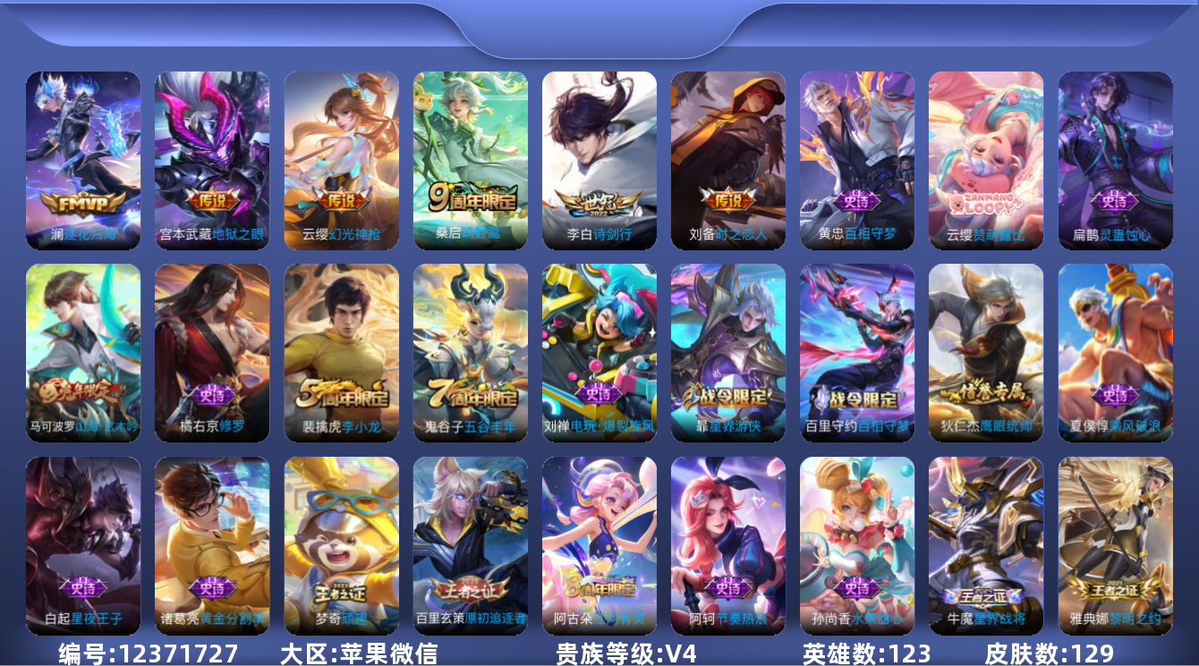 [12371727]打野49段【特价急出/详情看图】:苹果WX-V4-至尊星耀V段位-123英雄-129皮肤-6传说-30史诗