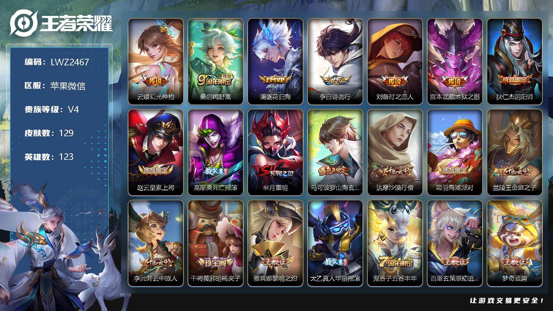 [12371727]打野49段【特价急出/详情看图】:苹果WX-V4-至尊星耀V段位-123英雄-129皮肤-6传说-30史诗 【传说皮肤】:云缨幻光神枪,桑启鸣野蒿,澜逐花归海,李白诗剑行,刘备时之恋人,宫本武藏地狱之眼 【限定皮肤】:狄仁杰阴阳师,赵云皇家上将,高渐离死亡摇滚,芈月重明,马可波罗山海玄木吟,达摩沙漠行僧,项羽海滩派对,兰陵王金庭之子,李元芳云中旅人,干将莫邪胡桃夹子,雅典娜黎明之约,太乙真人华丽摇滚,鬼谷子五谷丰年,百里玄策原初追逐者,梦奇顽趣,沈梦溪大漠名商,裴擒虎李小龙,裴擒虎擒涛扼浪,盾山御銮,嫦娥暖冬兔眠,鲁班大师探海日志,桑启海盐诗旅,暃星界游侠,阿古朵江河有灵,张良古海寻踪,蒙恬荣光圣徽,鬼谷子天穹祈灯 【年限皮肤】:马可波罗山海玄木吟 【赛季限定】:芈月重明,达摩沙漠行僧,兰陵王金庭之子,张良古海寻踪,李元芳云中旅人,雅典娜黎明之约,百里玄策原初追逐者,梦奇顽趣,沈梦溪大漠名商,裴擒虎擒涛扼浪,盾山御銮,鲁班大师探海日志,桑启海盐诗旅,鬼谷子天穹祈灯,蒙恬荣光圣徽 【战令限定】:嫦娥暖冬兔眠,暃星界游侠 【史诗皮肤】:赵云皇家上将,王昭君偶像歌手,宫本武藏鬼剑武藏,孙尚香水果甜心,吕布圣诞狂欢,刘邦德古拉伯爵,夏侯惇乘风破浪,诸葛亮黄金分割率,蔡文姬舞动绿茵,刘禅天才门将,白起星夜王子,阿轲节奏热浪,孙策猫狗日记,狄仁杰鹰眼统帅,橘右京修罗,百里玄策原初追逐者,裴擒虎李小龙,雅典娜黎明之约,鬼谷子五谷丰年,梦奇顽趣,暃星界游侠,马可波罗山海玄木吟,刘禅电玩爆裂旋风,阿古朵江河有灵,蒙恬荣光圣徽,百里守约百相守梦,牛魔星界战将,扁鹊灵蛊蚀心,云缨赞萌露比,黄忠百相守梦 【其他皮肤】:项羽海滩派对,韩信教廷特使,韩信街头霸王,达摩大发明家,赵云忍炎影,牛魔西部大镖客,武则天东方不败,扁鹊救世之瞳,宫本武藏未来纪元,孙膑天使之翼,亚瑟死亡骑士,花木兰兔女郎,甄姬花好人间,刘备万事如意,宫本武藏万象初新,狄仁杰阴阳师,刘备纽约教父,高渐离死亡摇滚,刘备汉昭烈帝,关羽龙腾万里,钟无艳海滩丽影,芈月重明,老夫子功夫老勺,孙尚香沉稳之力,诸葛亮掌控之力,太乙真人华丽摇滚,明世隐虹云星官,小乔丁香结,盾山御銮,沈梦溪鲨炮海盗猫,刘禅秘密基地,鲁班大师乓乓大师,干将莫邪胡桃夹子,达摩沙漠行僧,兰陵王金庭之子,沈梦溪大漠名商,蒙恬蔚蓝守将,李元芳云中旅人,戈娅危途狂花,