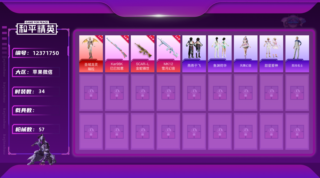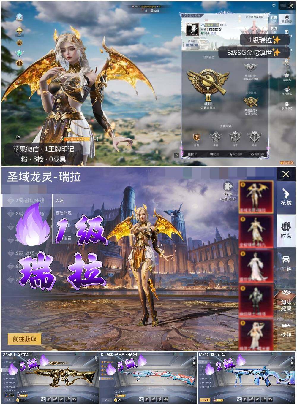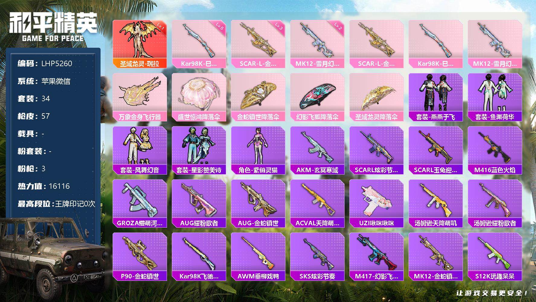 [12371750]素材身法号【特价急出/详情看图】:苹果 微信-1神装-3特效枪-1粉色飞行器-16116热力值-1王牌印记-34套装-57枪皮【红色神装等级】:圣域龙灵-瑞拉(一级)【粉色枪皮等级】:SCAR-L-金蛇镇世(三级),汤姆逊-星月云朵(二级MK12-雪月幻音),Kar98K-巳巳如意(五级)【粉色飞行器】:万象金身飞行器