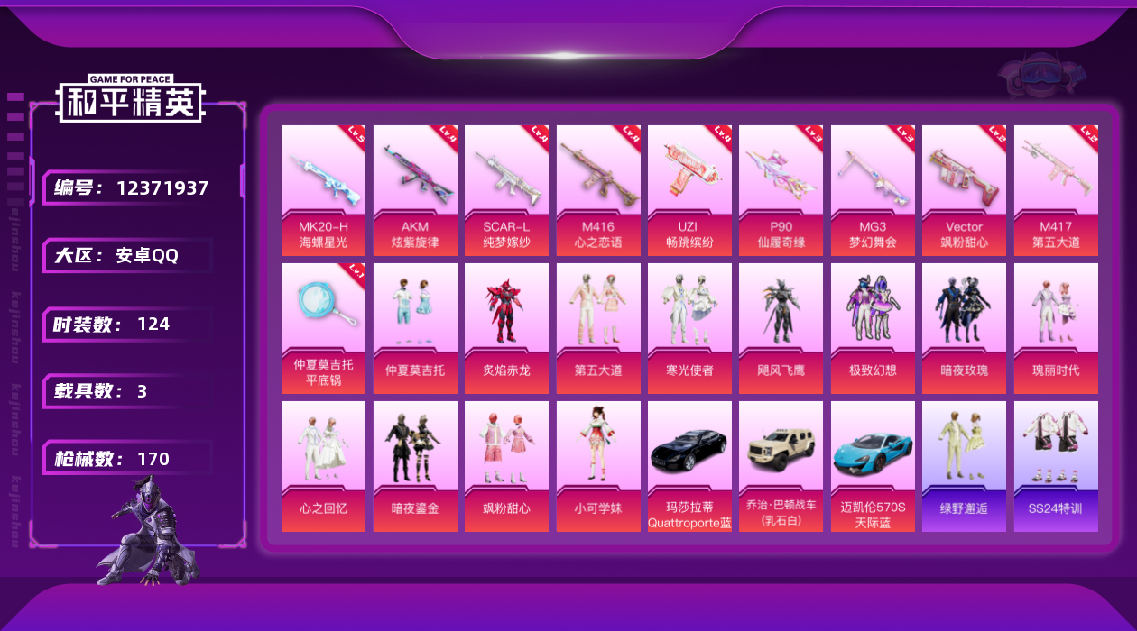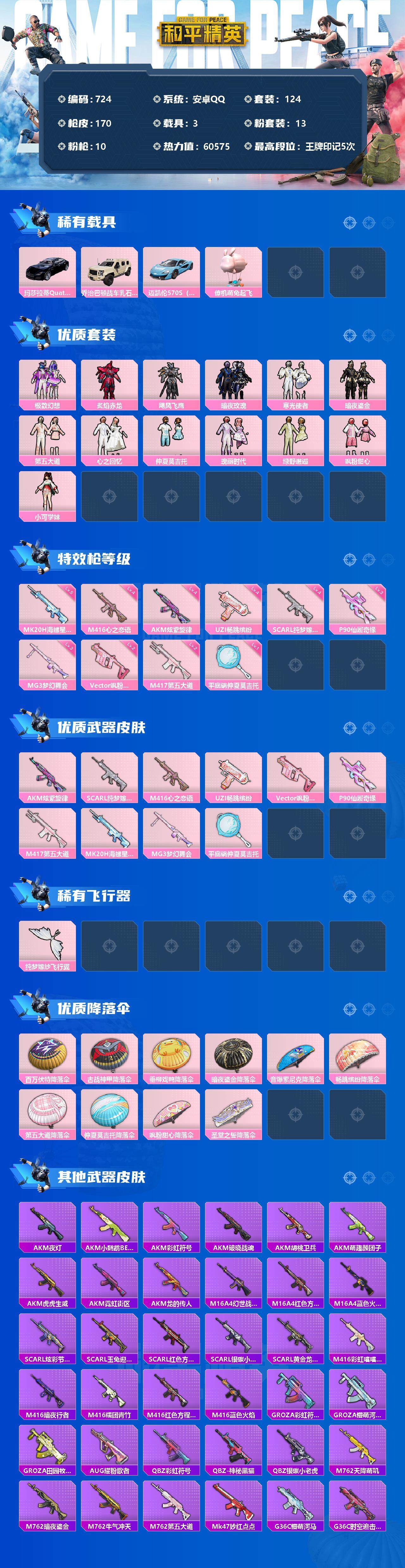 [12371937]【商品标题】:安卓 手Q-13粉装-10特效枪-3载具-1粉色飞行器-60575热力值-5王牌印记-124套装-170枪皮