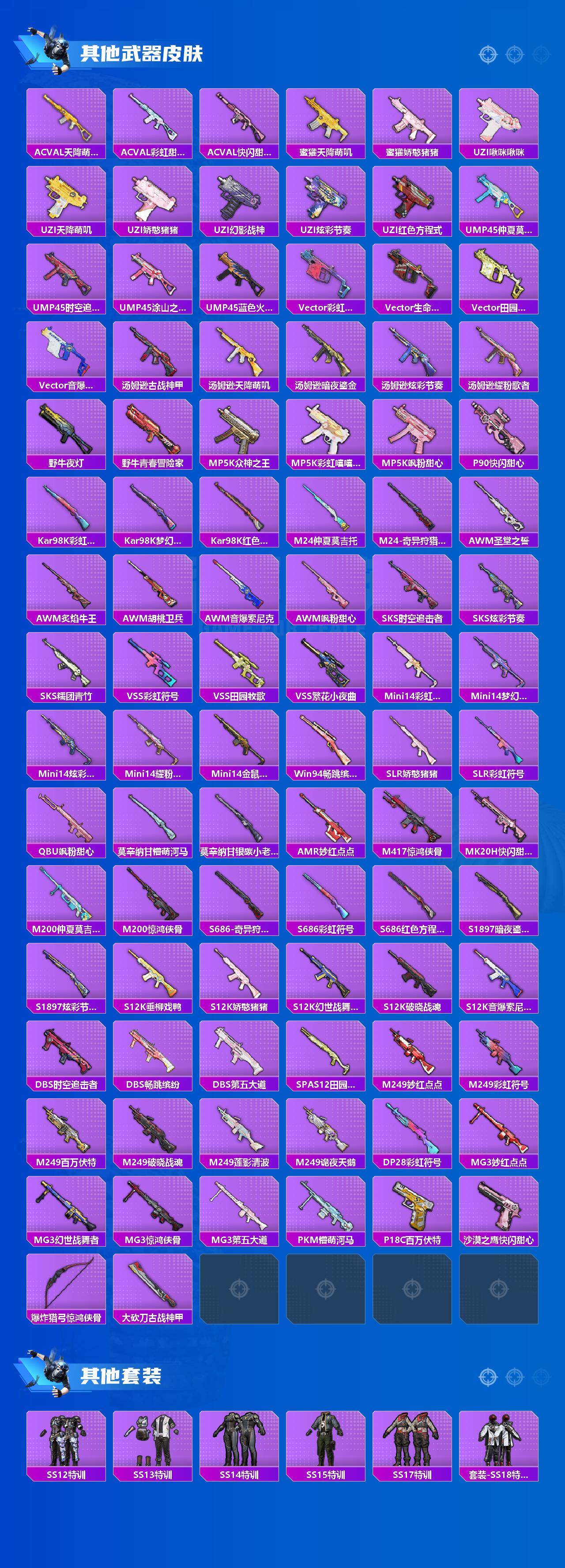 - [11883496]6粉装 8特效枪 12印记 可二次 可修改实名 优质装备:MG3洛神天依,M416五爪金龙,SCAR-L童趣迷兔,炙焰红王,冰霜白皇,AKM梦之光华,洛天依,UMP45恐龙拽拽,M24莲影清波,DP-28圣堂之誓,Kar98K-巳巳如意 热门装扮:恐龙拽拽,闲梦青缨,猪猪侠,兔兔白日梦,深海小丑鱼 五级特效枪:五级SCAR-L-童趣迷兔,五级M416-五爪金龙,五级Kar98K-巳巳如意 四级特效枪:四级DP-28-圣堂之誓,四级M24-莲影清波,四级MG3-洛神天依,四级AKM-梦之光华,四级UMP45-恐龙拽拽 紫色装扮:SS22特训,SS23特训,幻彩翩翩,灵蜜圈圈,妙红点点,香榭午后,SS21特训,浪漫假日,SS31特训套装,霓虹热舞,旭日情侣,SS30特训套装,云朵鹅,彩虹兔,雪绒豹,SS33特训套装,青涩时光,顶瓜瓜,SS13特训,SS14特训,豚鼠丹丹,雪兔飞飞,电音精灵,天籁歌者,魔力冰咖,都市漫游者,长空猛禽,霓虹街区,缤纷果语,荣耀,街头潮人,骑行爱好者,鹤鸣,龙的传人,龟仙人,香桃花海,极地朋克,柠萌假日,沙漠兵团,海岛探路者,涂山之恋,坚韧舞者,湖蓝色名流,白熊同盟,甜蜜告白,空岛之星,王牌教练,灰色格斗者,特殊使命,特训学院,SS29特训,星途旅人,SS28特训,异域银装,巳巳如意,竞技名士,绒宝小鹅,银尘,春野茶蘼,惊鸿侠骨,甜梦熊熊,神气柴柴,懵萌河马,SS24特训(SS24特训套装),绚紫流光,幽秘魅影,SS25特训,绝对偶像,元气发射,锦衣飞扬,湖雨初晴,SS27特训,忠真马岱,晨曦薄雾,SS26特训,春光漫游,快闪甜心,贝斯之夜,闪耀星光,玲珑飞花,SS32特训服(SS32特训套装),青玉碎影,绯格组合,萌黄之夏 优质战备:圣堂之誓降落伞,星途旅人降落伞,龙行天下降落伞,莲影清波降落伞,恐龙拽拽降落伞,千金淑猫降落伞,沙丘之主降落伞,绯穹魔姬降落伞,未来歌姬降落伞,炎氏战神飞行翼,粉樱探戈降落伞,炫光之旅降落伞,星之信仰降落伞,童趣迷兔降落伞,洛神天依降落伞