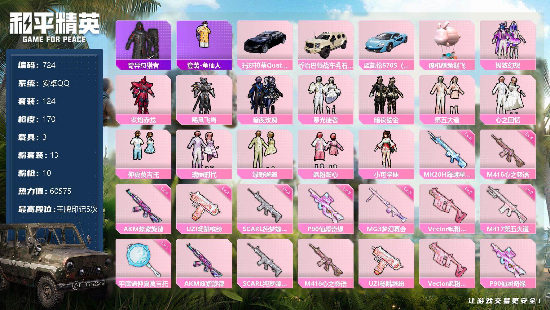 [12371937]【商品标题】:安卓 手Q-13粉装-10特效枪-3载具-1粉色飞行器-60575热力值-5王牌印记-124套装-170枪皮 【热门品类】:套装-奇异狩猎者,套装-龟仙人 【粉色载具】:玛莎拉蒂Quattroporte(夜幕蓝),乔治巴顿战车(乳石白),迈凯伦570S(天际蓝),僚机-萌兔起飞 【粉色套装】:粉装-极致幻想,粉装-炙焰赤龙,粉装-飓风飞鹰,粉装-暗夜玫瑰,粉装-寒光使者,粉装-暗夜鎏金,粉装-第五大道,粉装-心之回忆,粉装-仲夏莫吉托,粉装-瑰丽时代,粉装-绿野邂逅,粉装-飒粉甜心,角色-小可学妹 【粉色枪皮等级】:AKM-炫紫旋律(四级),SCAR-L-纯梦嫁纱(四级),M416-心之恋语(四级),UZI-畅跳缤纷(四级),Vector-飒粉甜心(二级),P90-仙履奇缘(三级),M417-第五大道(二级),MK20-H-海螺星光(五级),MG3-梦幻舞会(三级),平底锅-仲夏莫吉托(一级) 【粉色枪皮】:AKM-炫紫旋律,SCAR-L-纯梦嫁纱,M416-心之恋语,UZI-畅跳缤纷,Vector-飒粉甜心,P90-仙履奇缘,M417-第五大道,MK20-H-海螺星光,MG3-梦幻舞会,平底锅-仲夏莫吉托 【粉色飞行器】:纯梦嫁纱飞行翼 【粉色降落伞】:百万伏特降落伞,古战神甲降落伞,垂柳戏鸭降落伞,暗夜鎏金降落伞,音爆索尼克降落伞,畅跳缤纷降落伞,第五大道降落伞,仲夏莫吉托降落伞,飒粉甜心降落伞,圣堂之誓降落伞 【稀有套装】:套装-龟仙人 【稀有枪皮】:AKM-夜灯,AKM-小鹦鹉BEBE,AKM-彩虹符号,AKM-破晓战魂,AKM-胡桃卫兵,AKM-萌趣颜团子,AKM-虎虎生威,AKM-霓虹街区,AKM-龙的传人,M16A4-幻世战舞者,M16A4-红色方程式,M16A4-蓝色火焰,SCAR-L-炫彩节奏,SCAR-L-玉兔迎春,SCAR-L-红色方程式,SCAR-L-银碳小老虎,SCAR-L-黄金龙骨,M416-彩虹嘻嘻猴,M416-暗夜行者,M416-糯团青竹,M416-红色方程式,M416-蓝色火焰,GROZA-彩虹符号,GROZA-懵萌河马,GROZA-田园牧歌,AUG-耀粉歌者,QBZ-彩虹符号,QBZ-神秘黑猫,QBZ-银碳小老虎,M762-天降萌叽,M762-暗夜鎏金,M762-牛气冲天,M762-第五大道,Mk47-妙红点点,G