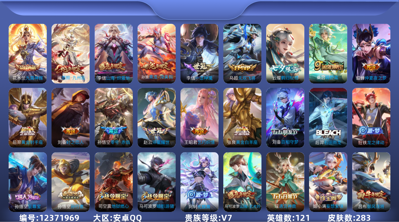 [12371969]【商品标题】:安卓Q-V7-最强王者段位-121英雄-283皮肤-1典藏-0珍品无双-0无双-0珍品传说-14传说-91史诗