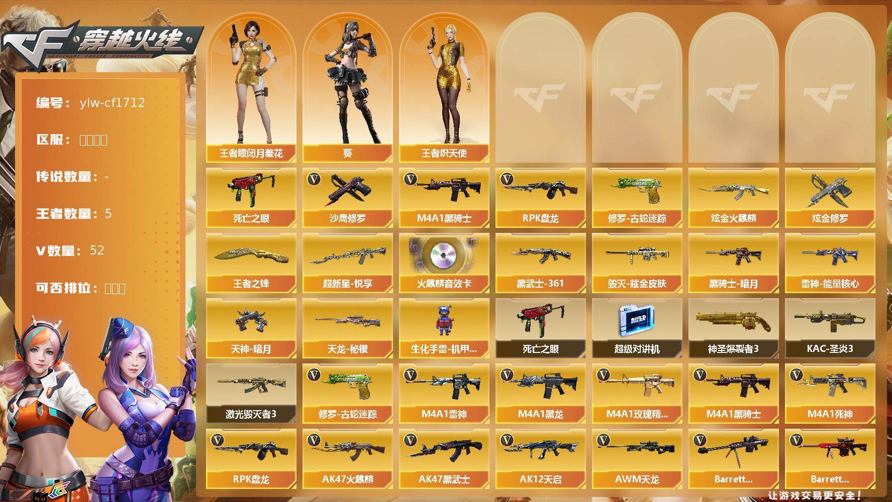[12371884]【商品标题】:云南一区-52V-5王者-3炫金 【热门武器】:修罗-古蛇迷踪,死亡之眼*4,M4A1-黑骑士,RPK-盘龙,沙鹰-修罗*5 【王者炫金武器】:炫金火麒麟,炫金修罗*2,超新星-悦享,王者之锋 【音效卡】:AK47-火麒麟音效卡 【稀有皮肤】:雷神-能量核心*3,黑骑士-暗月*2,毁灭耀金皮肤,天龙-秘银,AK47-黑武士-361,天神-暗月 【角色】:王者-瞳-闭月羞花,王者炽天使,葵 【人偶武器】:生化手雷-机甲核心 【暴走生化】:死亡之眼*4,超级对讲机 【挑战大师】:神圣爆裂者III,KAC-圣炎切割者III,激光毁灭者III*3 【英雄级武器】:M4A1-武圣,Glock18-武圣,烈火-动感闪耀,天神-动感闪耀,屠龙-动感闪耀,手雷-动感闪耀,无影-神兵利器,M4A1-雷神,M4A1-黑龙*2,M4A1-玫瑰精灵,M4A1-黑骑士,M4A1-死神,RPK-盘龙,AK47-火麒麟,AK47-黑武士*2,AK12-天启,AWM-天龙,Barrett-毁灭,Barrett-极光,AWM-裁决,黑武士-锦绣游龙,AK-47-猩红传说,修罗-古蛇迷踪,沙鹰-天神*2,沙鹰-修罗*5,麒麟刺*2,擎天*2,龙啸*4,屠龙*4 【特殊枪械】:1黑骑士,,1盘龙