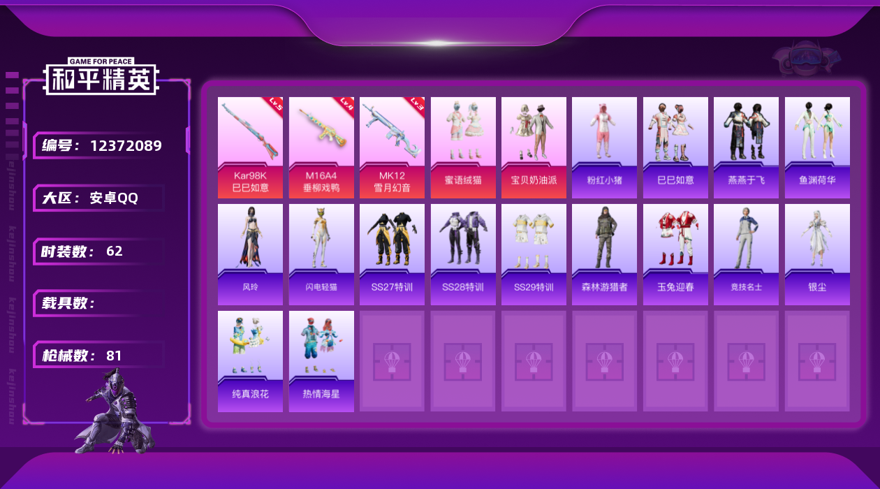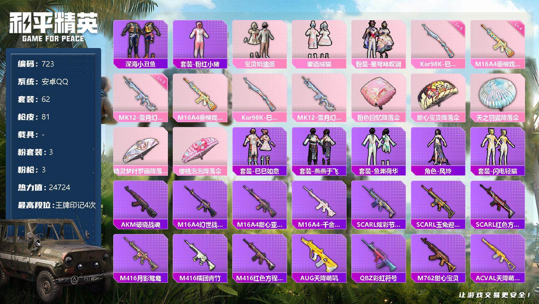 [12372089]【商品标题】:安卓 手Q-3粉装-3特效枪-0载具-0粉色飞行器-24724热力值-4王牌印记-62套装-81枪皮