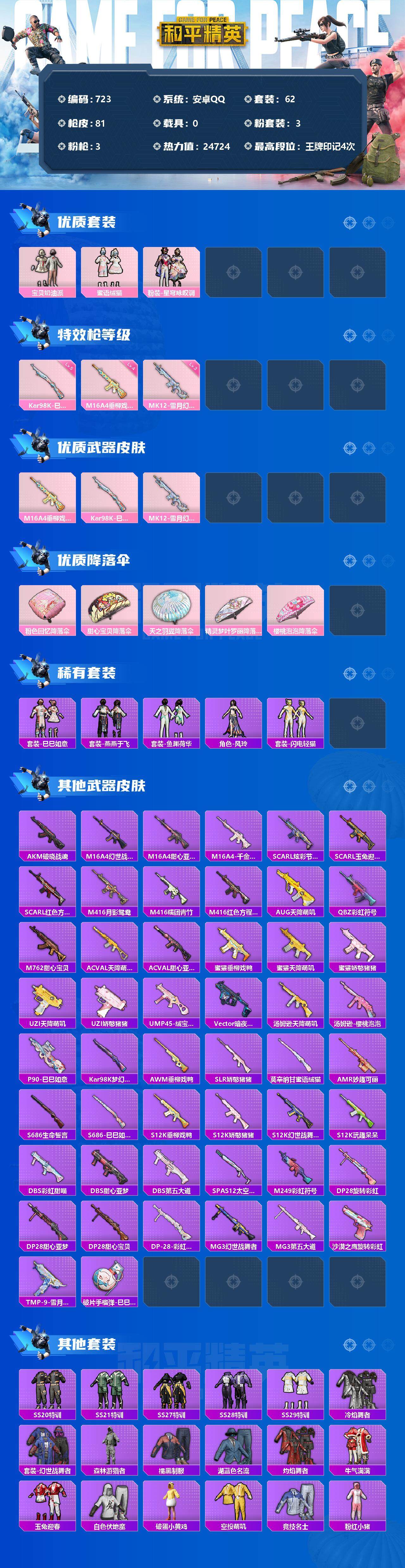 [12372089]【商品标题】:安卓 手Q-3粉装-3特效枪-0载具-0粉色飞行器-24724热力值-4王牌印记-62套装-81枪皮 【热门品类】:套装-深海小丑鱼,套装-粉红小猪 【粉色套装】:粉装-宝贝奶油派,粉装-蜜语绒猫,粉装-星穹咏叹调 【粉色枪皮等级】:M16A4-垂柳戏鸭(四级),Kar98K-巳巳如意(五级),MK12-雪月幻音(三级) 【粉色枪皮】:M16A4-垂柳戏鸭,Kar98K-巳巳如意,MK12-雪月幻音 【粉色降落伞】:粉色回忆降落伞,甜心宝贝降落伞,天之羽翼降落伞,精灵梦叶罗丽降落伞,樱桃泡泡降落伞 【稀有套装】:套装-巳巳如意,套装-燕燕于飞,套装-鱼渊荷华,角色-风玲,套装-闪电轻猫 【稀有枪皮】:AKM-破晓战魂,M16A4-幻世战舞者,M16A4-甜心亚梦,M16A4-千金淑猫,SCAR-L-炫彩节奏,SCAR-L-玉兔迎春,SCAR-L-红色方程式,M416-月影鸳鸯,M416-糯团青竹,M416-红色方程式,AUG-天降萌叽,QBZ-彩虹符号,M762-甜心宝贝,AC-VAL-天降萌叽,AC-VAL-甜心亚梦,蜜獾-垂柳戏鸭,蜜獾-天降萌叽,蜜獾-娇憨猪猪,UZI-天降萌叽,UZI-娇憨猪猪,UMP45-绒宝小鹅,Vector-暗夜玫瑰,汤姆逊-天降萌叽,汤姆逊-樱桃泡泡,P90-巳巳如意,Kar98K-梦幻火箭,AWM-垂柳戏鸭,SLR-娇憨猪猪,莫辛纳甘-蜜语绒猫,AMR-妙趣可丽,S686-生命誓言,S686-巳巳如意,S12K-玩趣呆呆,S12K-垂柳戏鸭,S12K-娇憨猪猪,S12K-幻世战舞者,DBS-彩虹甜喵,DBS-甜心亚梦,DBS-第五大道,SPAS-12-太空嘟嘟,M249-彩虹符号,DP-28-旋转彩虹,DP-28-甜心亚梦,DP-28-甜心宝贝,DP-28-彩虹独角兽,MG3-幻世战舞者,MG3-第五大道,沙漠之鹰-旋转彩虹,TMP-9-雪月幻音,破片手榴弹-巳巳如意 【其他套装】:套装-SS20特训,套装-SS21特训,套装-SS27特训,套装-SS28特训,套装-SS29特训,套装-冷焰舞者,套装-幻世战舞者,套装-森林游猎者,套装-橘黑制服,套装-湖蓝色名流,套装-灼焰舞者,套装-牛气满满,套装-玉兔迎春,套装-白色伏地魔,套装-破蛋小黄鸡,套装-空投萌叽,套装-竞技名士,套装-粉红小猪,套装-红色运动,套装-