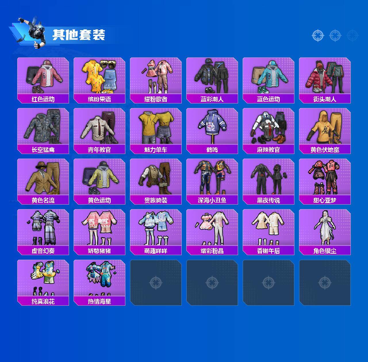 【其他套装】:套装-SS20特训,套装-SS21特训,套装-SS27特训,套装-SS28特训,套装-SS29特训,套装-冷焰舞者,套装-幻世战舞者,套装-森林游猎者,套装-橘黑制服,套装-湖蓝色名流,套装-灼焰舞者,套装-牛气满满,套装-玉兔迎春,套装-白色伏地魔,套装-破蛋小黄鸡,套装-空投萌叽,套装-竞技名士,套装-粉红小猪,套装-红色运动,套装-