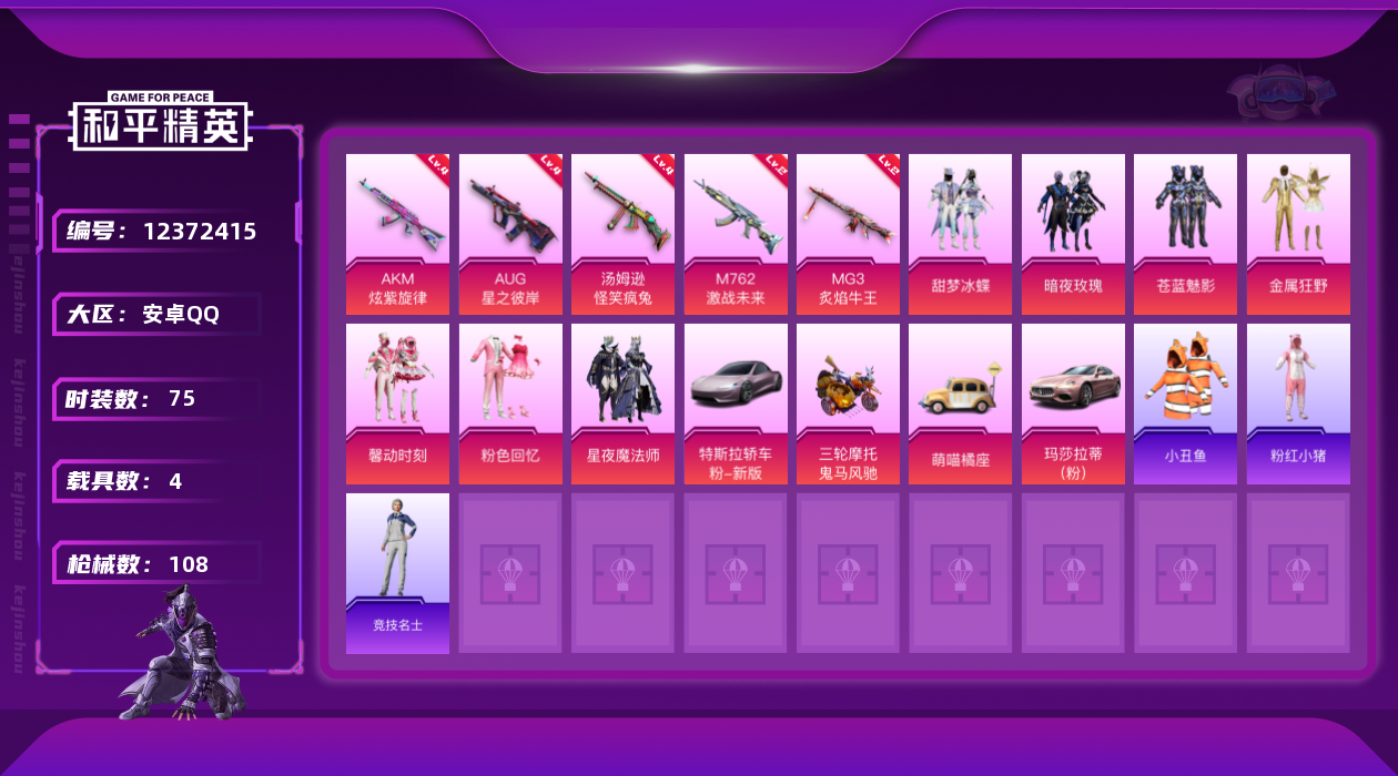 [12372415]【商品标题】:安卓 手Q-7粉装-5特效枪-4载具-2粉色飞行器-41221热力值-1王牌印记-75套装-108枪皮