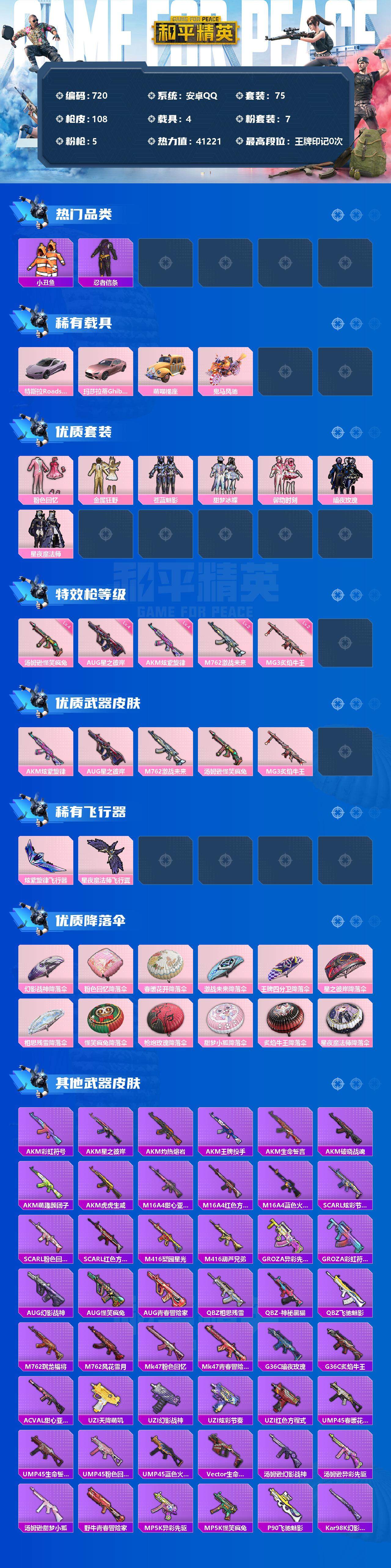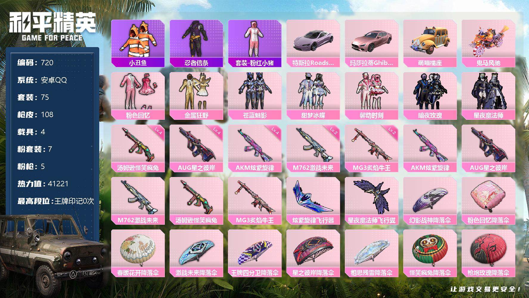 [12372415]【商品标题】:安卓 手Q-7粉装-5特效枪-4载具-2粉色飞行器-41221热力值-1王牌印记-75套装-108枪皮 【热门品类】:套装-小丑鱼,套装-忍者信条,套装-粉红小猪 【粉色载具】:特斯拉Roadster(沁心粉),玛莎拉蒂Ghibli(粉),萌喵橘座,鬼马风驰 【粉色套装】:粉装-粉色回忆,粉装-金属狂野,粉装-苍蓝魅影,粉装-甜梦冰蝶,粉装-馨动时刻,粉装-暗夜玫瑰,粉装-星夜魔法师 【粉色枪皮等级】:AKM-炫紫旋律(四级),AUG-星之彼岸(四级),M762-激战未来(二级),汤姆逊-怪笑疯兔(四级),MG3-炙焰牛王(二级) 【粉色枪皮】:AKM-炫紫旋律,AUG-星之彼岸,M762-激战未来,汤姆逊-怪笑疯兔,MG3-炙焰牛王 【粉色飞行器】:炫紫旋律飞行器,星夜魔法师飞行翼 【粉色降落伞】:幻影战神降落伞,粉色回忆降落伞,春暖花开降落伞,激战未来降落伞,王牌四分卫降落伞,星之彼岸降落伞,相思残雪降落伞,怪笑疯兔降落伞,枪炮玫瑰降落伞,甜梦小狐降落伞,炙焰牛王降落伞,星夜魔法师降落伞 【稀有枪皮】:AKM-彩虹符号,AKM-星之彼岸,AKM-灼热熔岩,AKM-王牌投手,AKM-生命誓言,AKM-破晓战魂,AKM-萌趣颜团子,AKM-虎虎生威,M16A4-甜心亚梦,M16A4-红色方程式,M16A4-蓝色火焰,SCAR-L-炫彩节奏,SCAR-L-粉色回忆,SCAR-L-红色方程式,M416-梨园星光,M416-葫芦兄弟,GROZA-异彩先驱,GROZA-彩虹符号,AUG-幻影战神,AUG-怪笑疯兔,AUG-青春冒险家,QBZ-相思残雪,QBZ-神秘黑猫,QBZ-飞驰魅影,M762-瑞龙福将,M762-风花雪月,Mk47-粉色回忆,Mk47-青春冒险家,G36C-暗夜玫瑰,G36C-炙焰牛王,AC-VAL-甜心亚梦,UZI-天降萌叽,UZI-幻影战神,UZI-炫彩节奏,UZI-红色方程式,UMP45-春暖花开,UMP45-生命誓言,UMP45-粉色回忆,UMP45-蓝色火焰,Vector-生命誓言,汤姆逊-幻影战神,汤姆逊-异彩先驱,汤姆逊-甜梦小狐,野牛-青春冒险家,MP5K-异彩先驱,MP5K-怪笑疯兔,P90-飞驰魅影,Kar98K-幻影战神,Kar98K-欢乐麻酱,Kar98K-炫彩节奏,Kar98K-飞驰魅影,M24-奇异狩猎者,AW