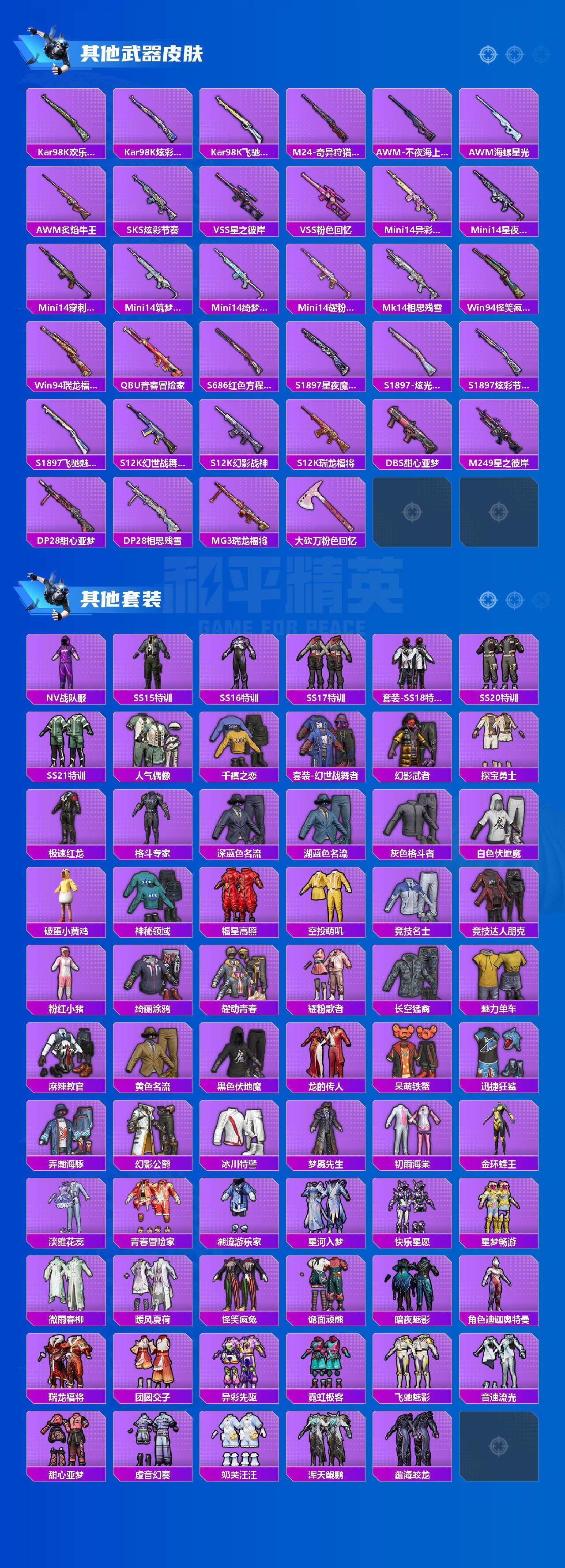 【稀有枪皮】:AKM-彩虹符号,AKM-星之彼岸,AKM-灼热熔岩,AKM-王牌投手,AKM-生命誓言,AKM-破晓战魂,AKM-萌趣颜团子,AKM-虎虎生威,M16A4-甜心亚梦,M16A4-红色方程式,M16A4-蓝色火焰,SCAR-L-炫彩节奏,SCAR-L-粉色回忆,SCAR-L-红色方程式,M416-梨园星光,M416-葫芦兄弟,GROZA-异彩先驱,GROZA-彩虹符号,AUG-幻影战神,AUG-怪笑疯兔,AUG-青春冒险家,QBZ-相思残雪,QBZ-神秘黑猫,QBZ-飞驰魅影,M762-瑞龙福将,M762-风花雪月,Mk47-粉色回忆,Mk47-青春冒险家,G36C-暗夜玫瑰,G36C-炙焰牛王,AC-VAL-甜心亚梦,UZI-天降萌叽,UZI-幻影战神,UZI-炫彩节奏,UZI-红色方程式,UMP45-春暖花开,UMP45-生命誓言,UMP45-粉色回忆,UMP45-蓝色火焰,Vector-生命誓言,汤姆逊-幻影战神,汤姆逊-异彩先驱,汤姆逊-甜梦小狐,野牛-青春冒险家,MP5K-异彩先驱,MP5K-怪笑疯兔,P90-飞驰魅影,Kar98K-幻影战神,Kar98K-欢乐麻酱,Kar98K-炫彩节奏,Kar98K-飞驰魅影,M24-奇异狩猎者,AW