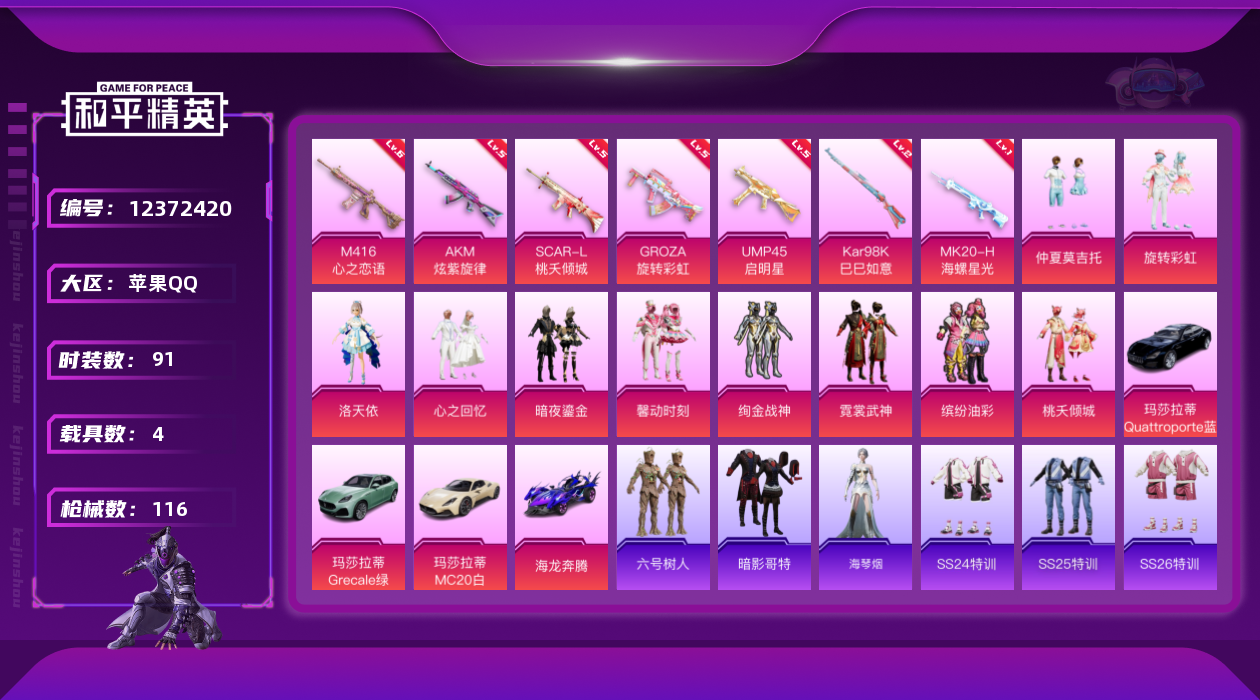 [12372420]【商品标题】:苹果 手Q-10粉装-7特效枪-4载具-2粉色飞行器-48504热力值-7王牌印记-91套装-116枪皮